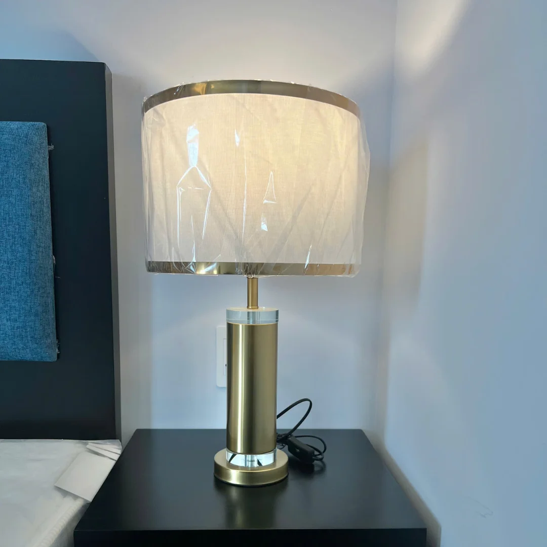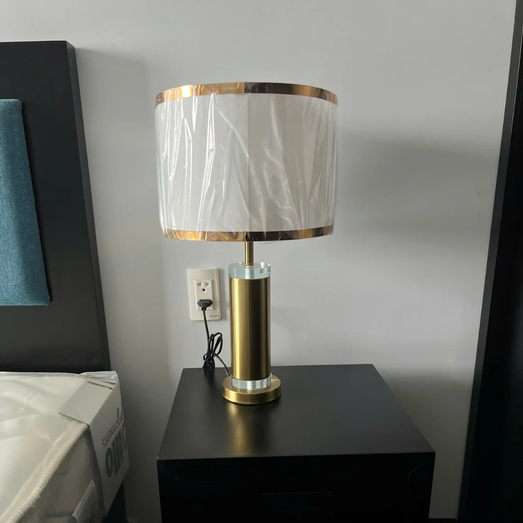 Thân đèn phù hợp với chất liệu kim loại hoàn thiện bề mặt ánh vàng, đi cùng phần đế và chi tiết nhấn ánh bạc. Chao đèn thuộc nhóm vải hoặc giả vải sáng màu, có thêm viền kim loại để tăng độ tinh tế. Sự kết hợp này giúp chiếc đèn vừa hiện đại vừa ấm áp. Chao vải cũng hỗ trợ làm vùng sáng dịu hơn, giúp không gian buổi tối trở nên thư giãn và dễ chịu hơn.