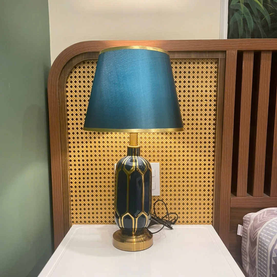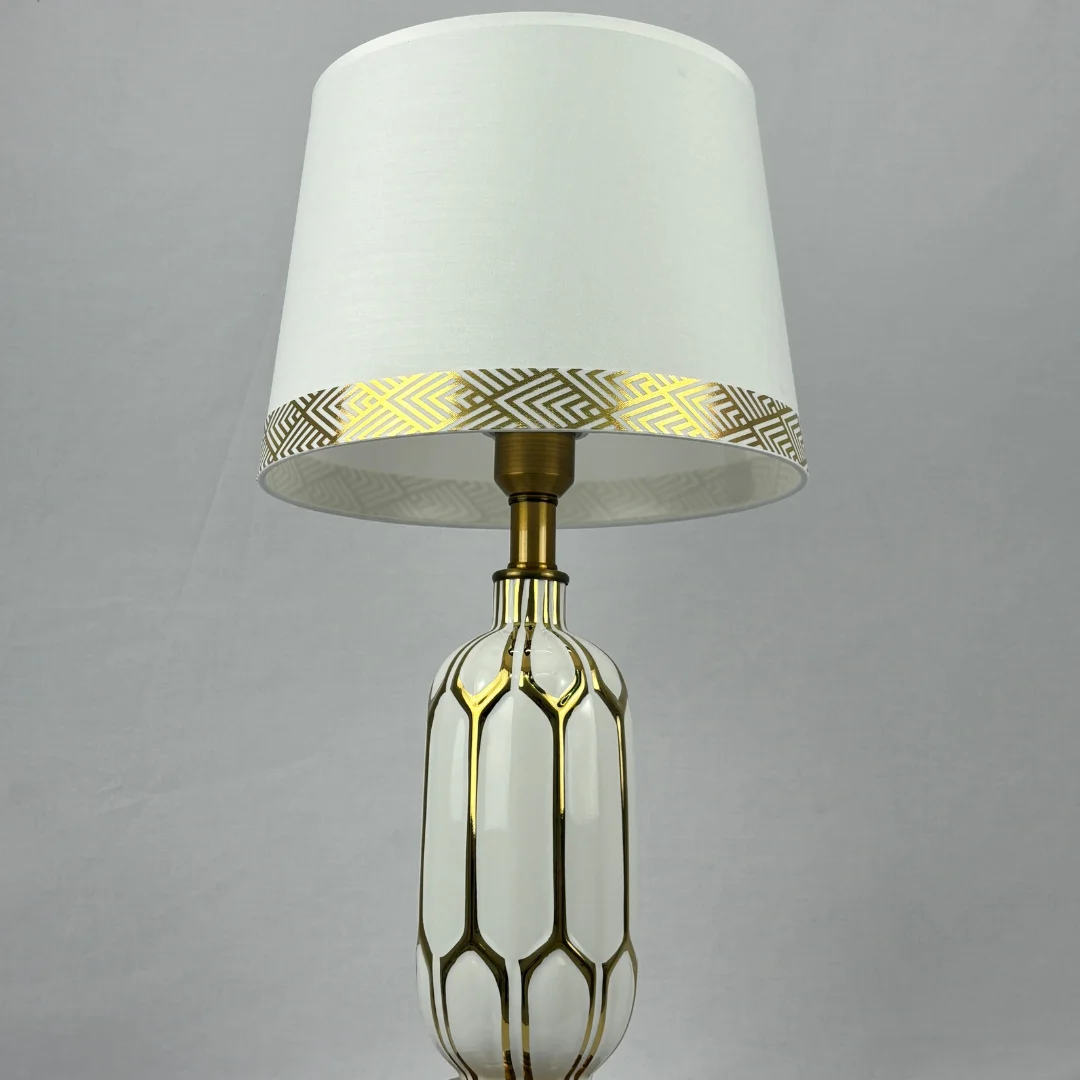 Thân đèn có bề mặt men bóng giống chất liệu gốm hoặc sứ cao cấp, kết hợp với các chi tiết kim loại ánh vàng ở cổ và chân đế. Chao đèn hoàn thiện theo hướng vải hoặc giả vải, giúp ánh sáng đi qua mềm và dịu hơn. Sự kết hợp này vừa đẹp về mặt thẩm mỹ, vừa phù hợp cho nhu cầu sử dụng hằng ngày vì tạo cảm giác ấm áp, dễ chịu và bền dáng theo thời gian.