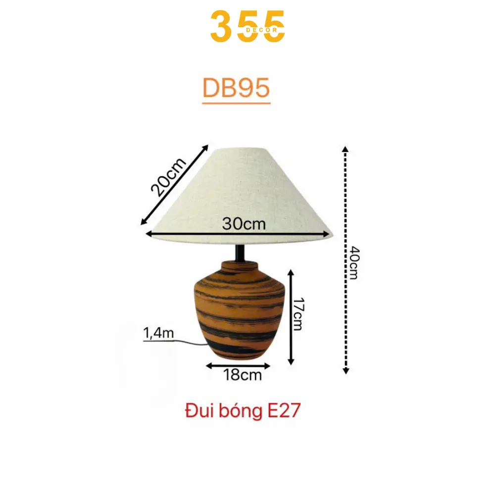 Đèn Bàn DB95 là lựa chọn lý tưởng cho những ai yêu thích phong cách trang nhã và ấm cúng trong không gian sống. Với thiết kế tinh tế, kết hợp giữa chất liệu gốm cao cấp và chụp vải tự nhiên. Sản phẩm không chỉ là đèn bàn chiếu sáng mà còn là điểm nhấn trang trí độc đáo. Mỗi chi tiết đều được chế tác tỉ mỉ, mang đến vẻ đẹp vừa hiện đại vừa truyền thống. Giúp tôn lên sự sang trọng cho phòng khách, phòng ngủ hay văn phòng làm việc. Hãy cùng 355Decor khám phá chi tiết mẫu Đèn Bàn DB95 để hiểu vì sao đây là sản phẩm được nhiều khách hàng lựa chọn.