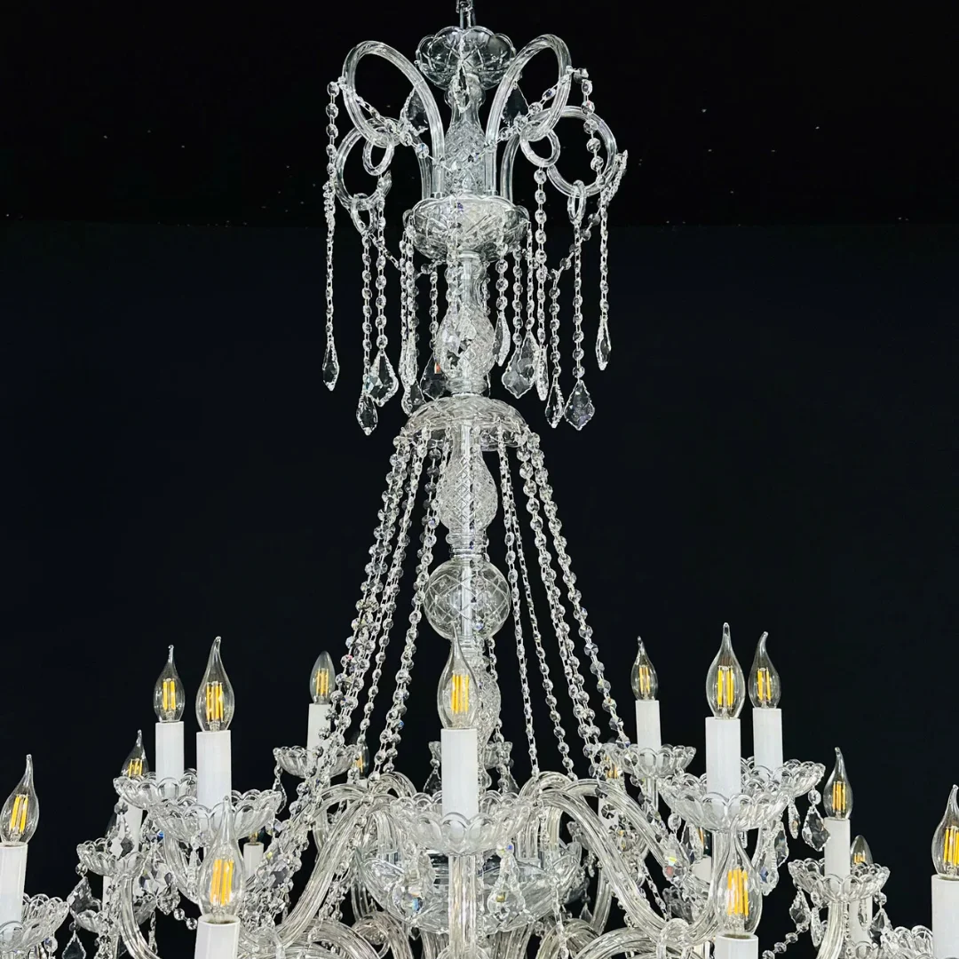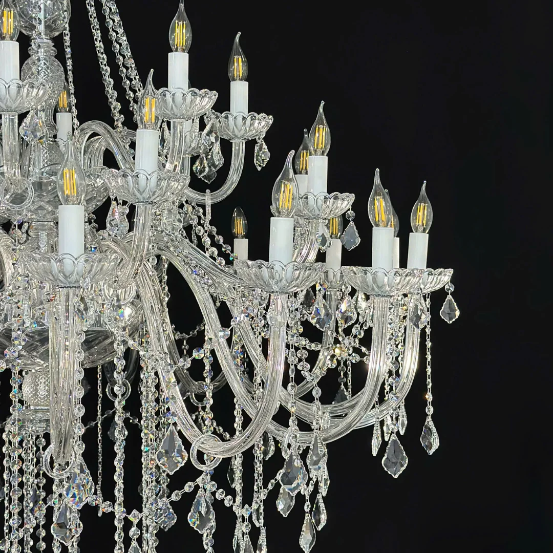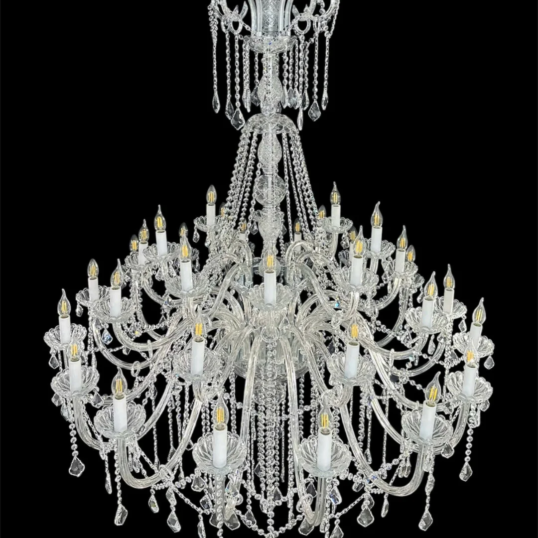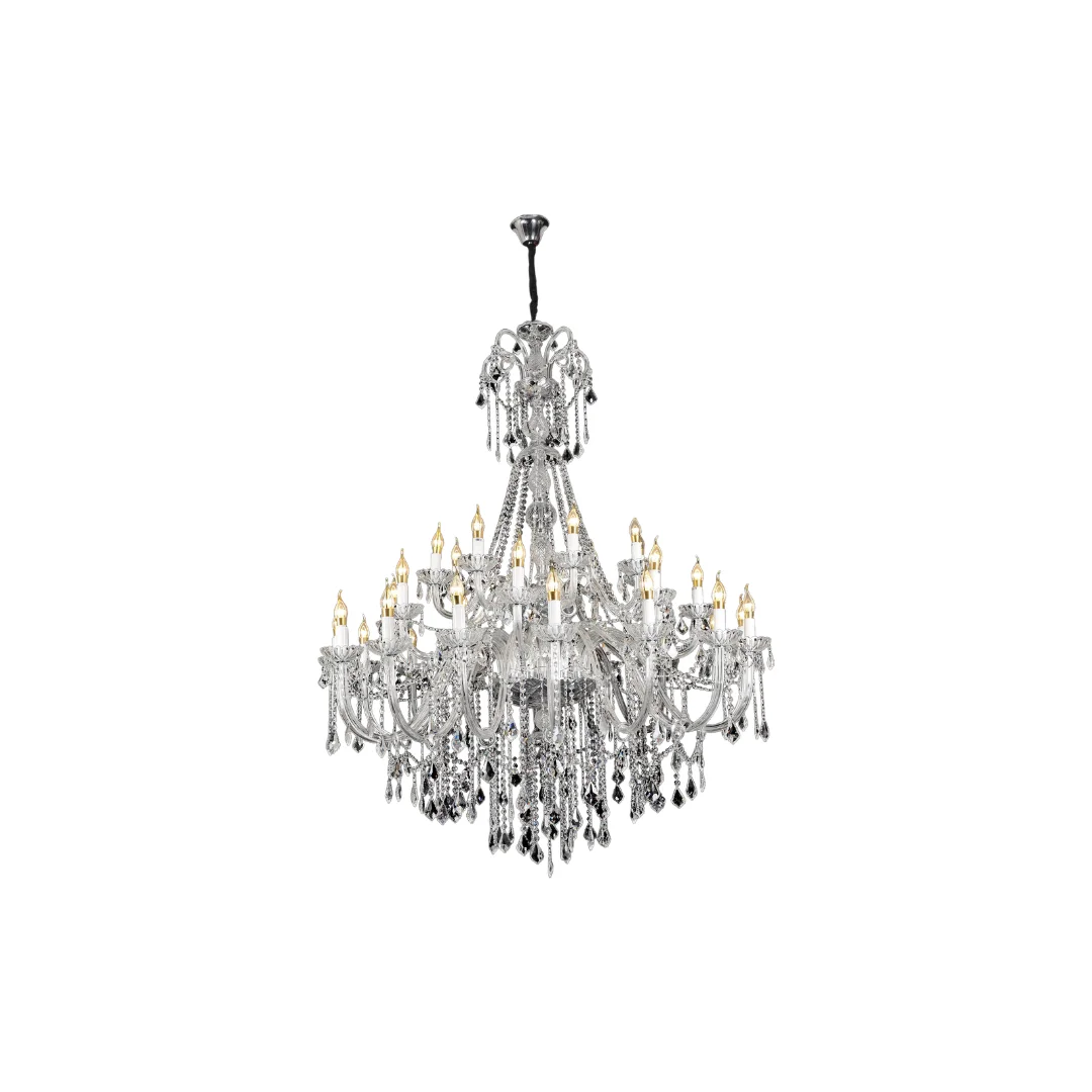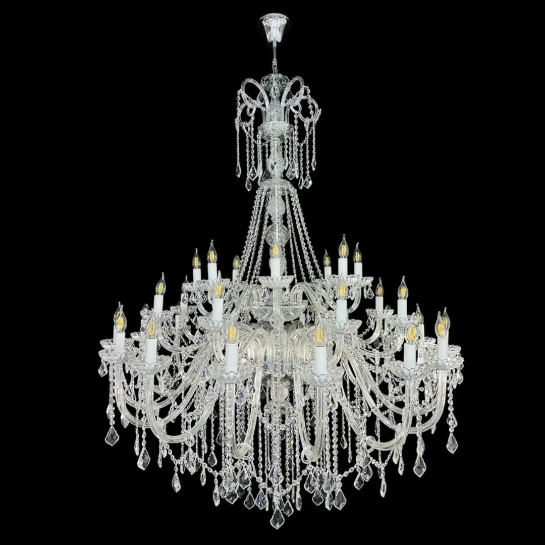 Đèn Chùm Pha Lê DC1057T32 sở hữu dáng chùm nến cổ điển với hệ tay đèn tỏa rộng, tạo bố cục nhiều tầng giúp tổng thể bề thế và cân đối. Phần thân đèn được nhấn bằng các chuỗi pha lê rũ dày, đổ xuống theo lớp tạo cảm giác mềm và sang, đồng thời tăng hiệu ứng phản chiếu khi ánh sáng bật lên. Các giọt pha lê thả đều quanh thân giúp đèn trông “đầy” và nổi bật hơn, đặc biệt phù hợp không gian trần cao vừa đến cao.