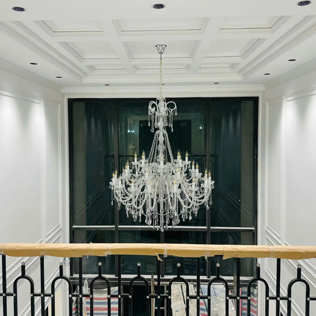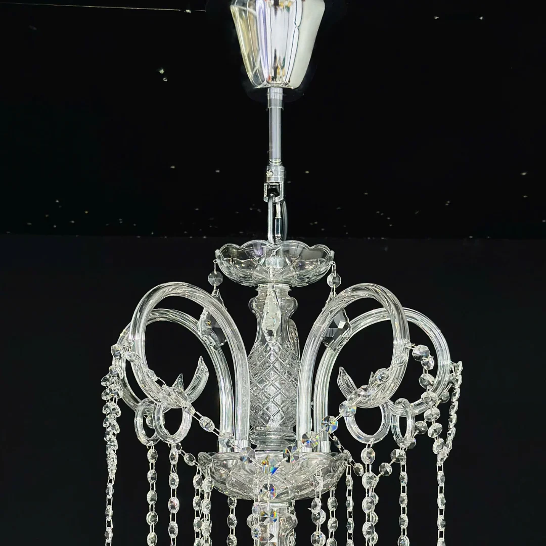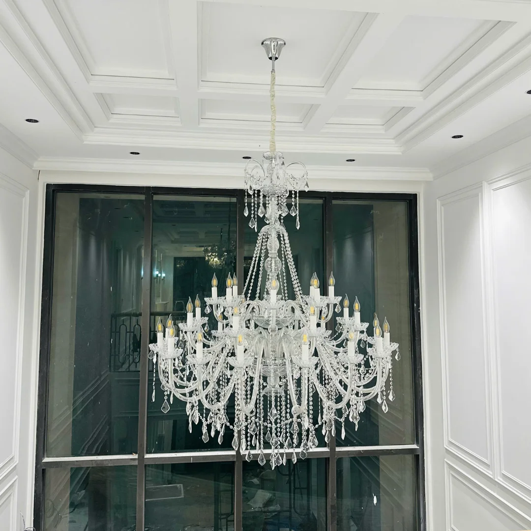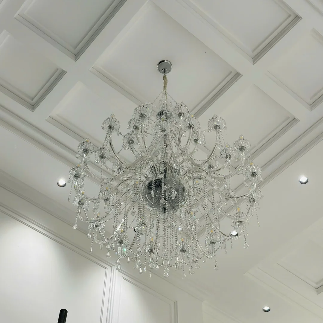 Tạo điểm nhấn lộng lẫy: Dáng nhiều tầng và pha lê rũ dày giúp không gian sang rõ ngay khi lắp.