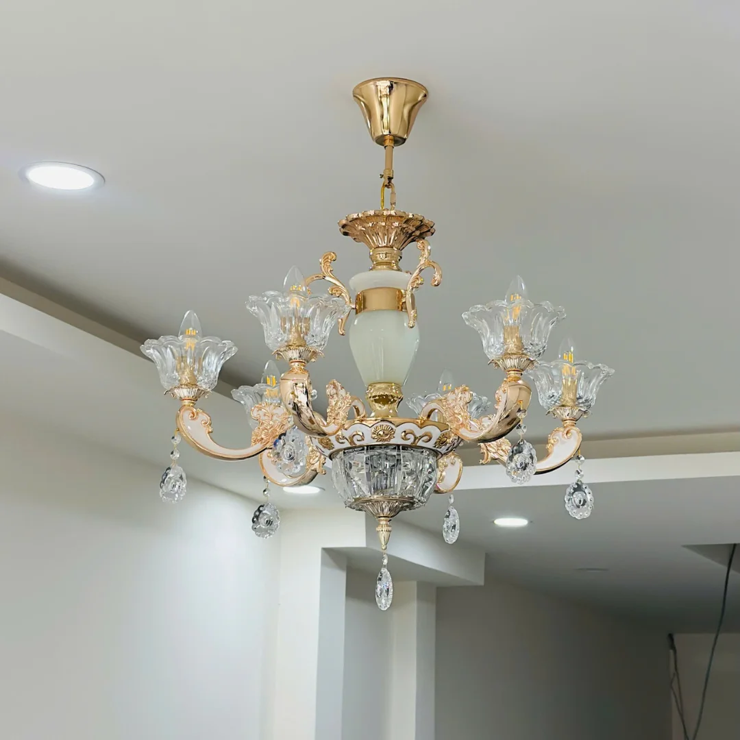 Đèn Chùm Pha Lê DC2036 sở hữu form chùm nến cổ điển với các tay đèn vươn đều, tạo bố cục cân đối và cảm giác trang nhã khi treo giữa phòng. Nhờ kiểu dáng gọn, DC2036 không làm không gian bị nặng, ngược lại còn giúp trần nhà trông cao và thoáng hơn. Khi bật sáng, ánh đèn đi qua lớp pha lê tạo độ lấp lánh tự nhiên, làm khu vực trung tâm trở nên nổi bật mà vẫn dễ chịu khi nhìn lâu.