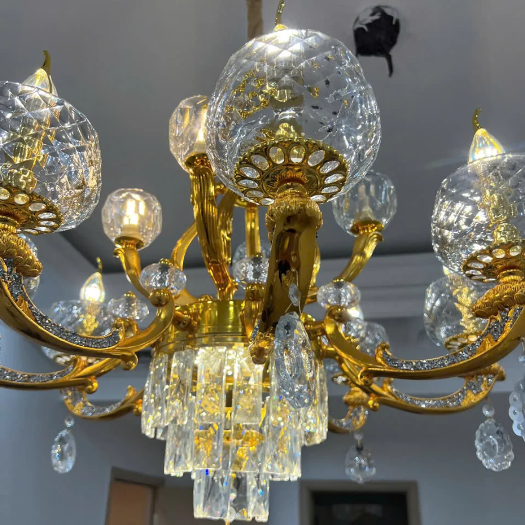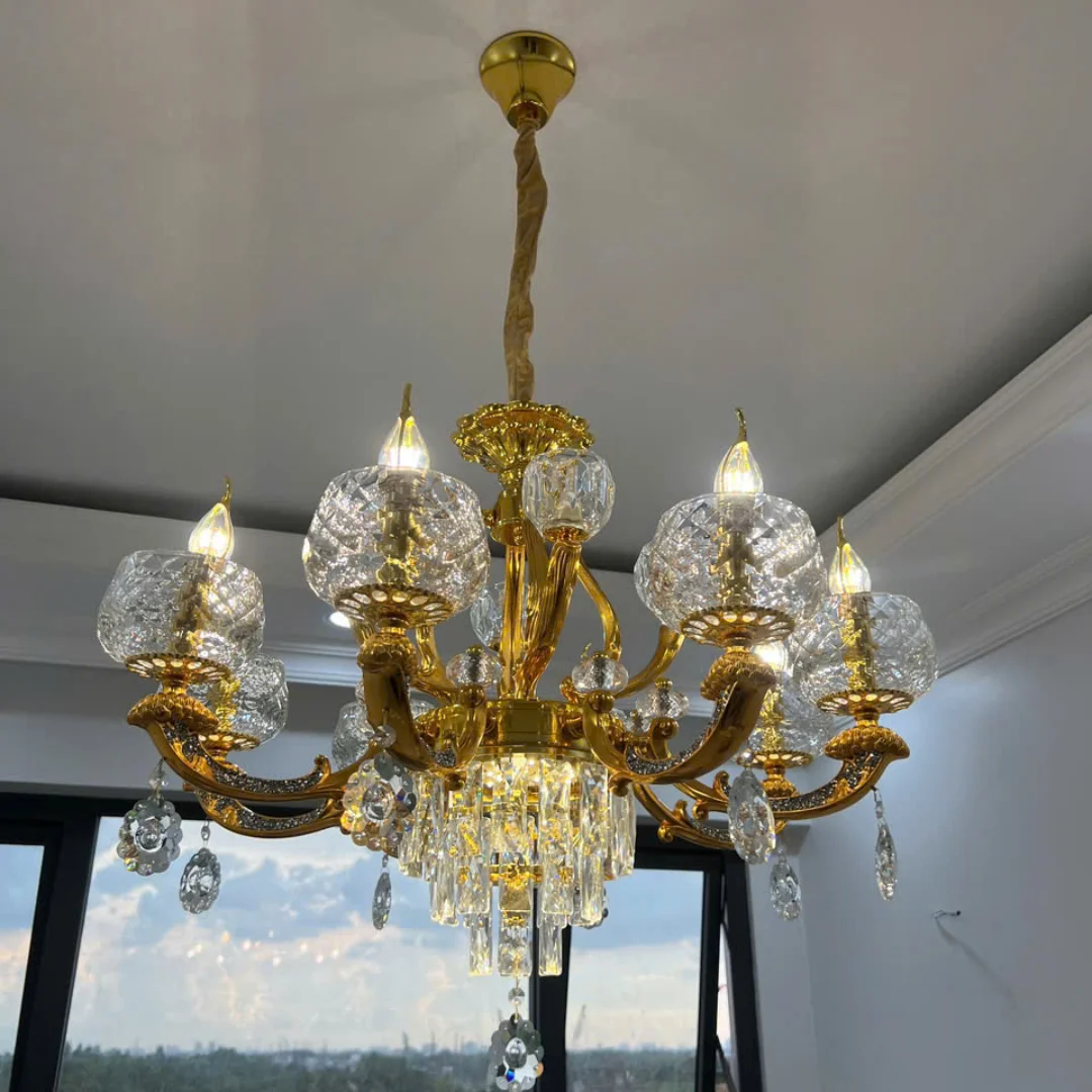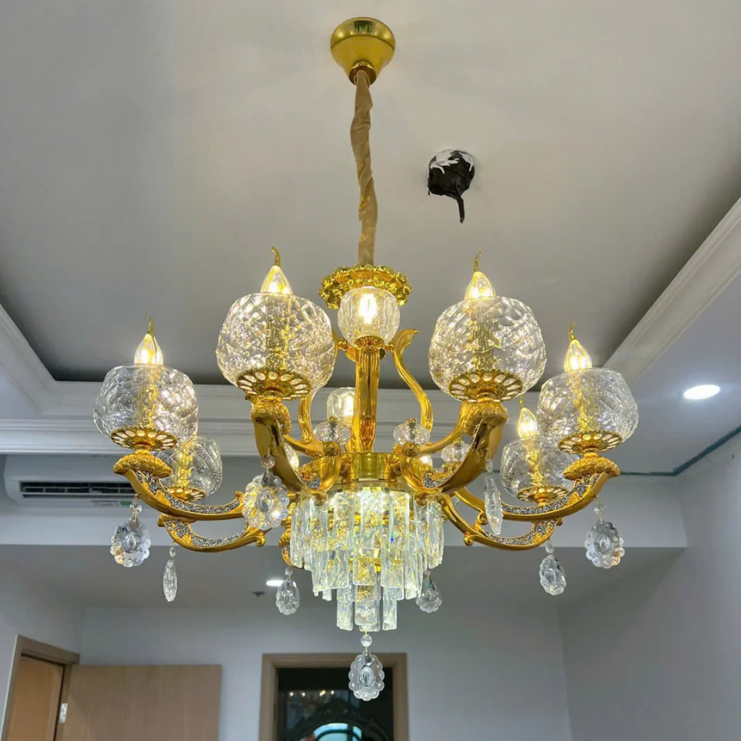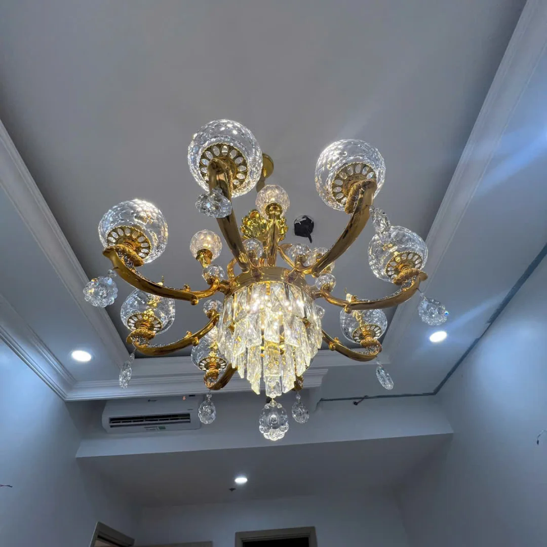 Tạo điểm nhấn sang trọng: Dáng tân cổ điển kết hợp pha lê giúp trần nhà nổi bật ngay khi lắp.
