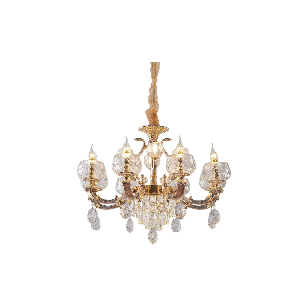 Đèn Chùm Pha Lê DC2088T8 có bố cục tay đèn tỏa đều, phần tay uốn cong mềm tạo cảm giác cân đối và bề thế vừa phải khi treo ở trung tâm trần. Tông vàng của khung giúp tổng thể sang và ấm, dễ phối với nội thất gỗ, tường sáng hoặc không gian tân cổ điển. Chao pha lê dạng khối trong, bề mặt có vân bắt sáng giúp ánh đèn trông lấp lánh hơn và tạo hiệu ứng đẹp khi nhìn từ nhiều góc.
