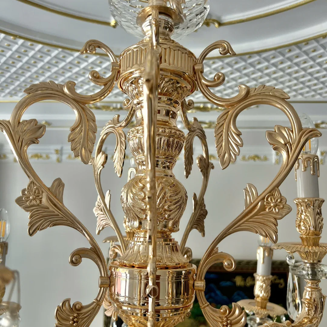 Đèn Chùm Pha Lê DC6237 sở hữu dáng chùm nến châu Âu với các tay đèn vươn đều, tạo bố cục cân xứng và cảm giác bề thế cho khu vực trung tâm. Phần thân đèn được nhấn bằng chi tiết hoa văn tinh xảo, kết hợp cụm pha lê xếp tầng dạng thác giúp tổng thể “đầy” và sang. Các giọt pha lê thả dọc tay đèn tạo nét mềm mại, đồng thời tăng hiệu ứng phản chiếu khi ánh sáng bật lên.