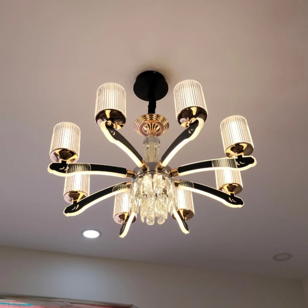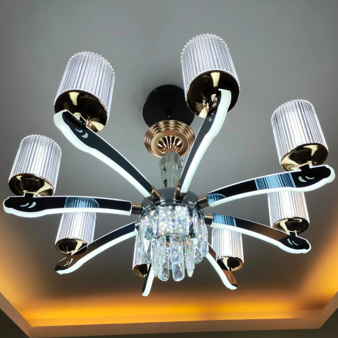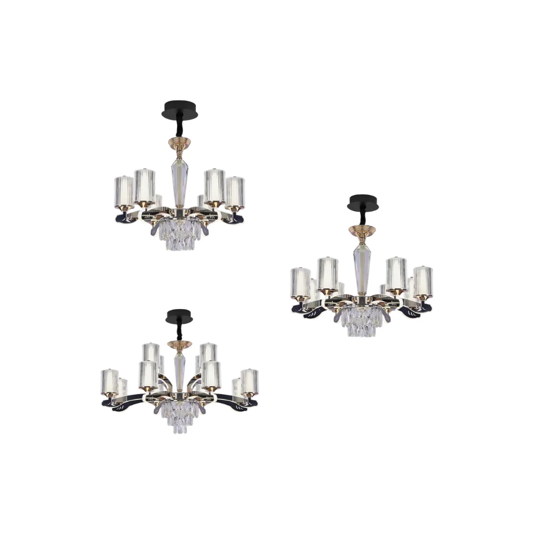 Đèn Chùm Pha Lê DC8835 sở hữu bố cục cân đối với tay đèn mở rộng theo chiều ngang, tạo cảm giác thoáng trần và giúp ánh sáng tỏa đều quanh khu vực trung tâm. Điểm dễ nhận thấy là chao đèn dạng ống với bề mặt sọc, vừa tạo nét hiện đại vừa giúp ánh sáng trông mềm và sang hơn khi bật lên. Phần thân đèn thon gọn, kết hợp các chi tiết trong suốt tạo cảm giác cao cấp và tinh tế.