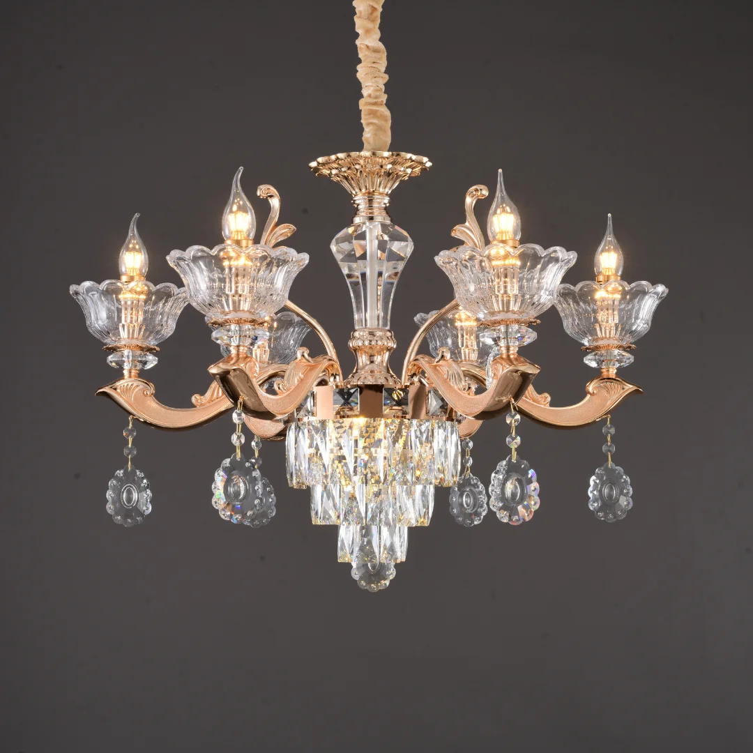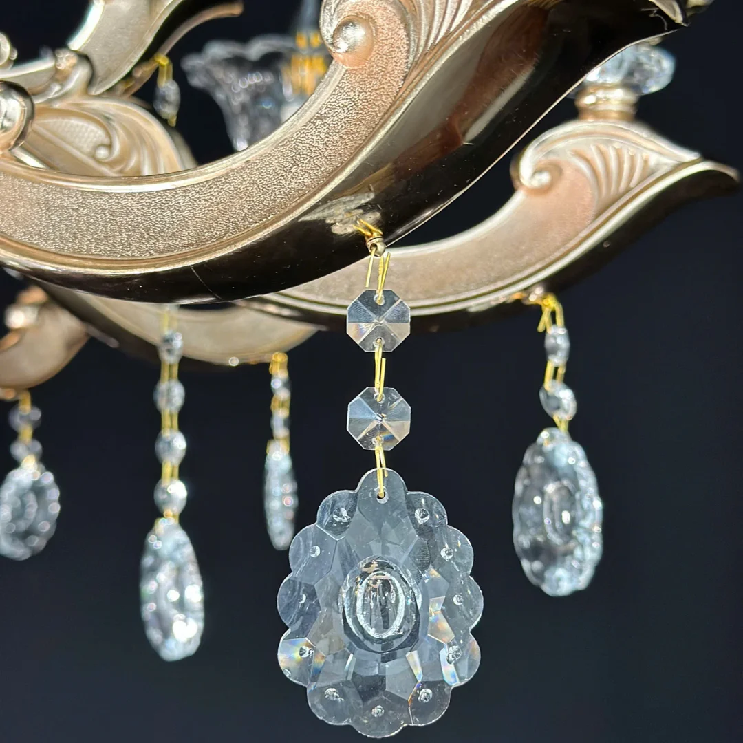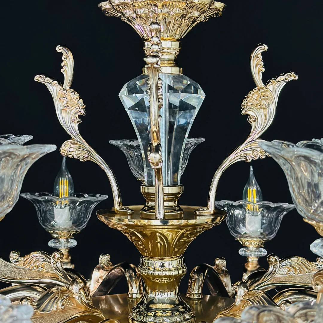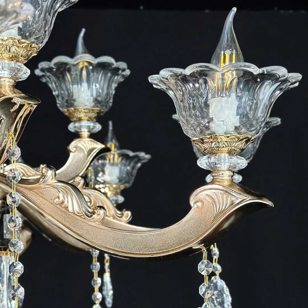 Đèn Chùm Pha Lê DC891 mang dáng chùm tân cổ điển với tay đèn uốn cong mềm mại, phân bố cân đối xung quanh thân đèn trung tâm. Phần chén đèn tạo hình như cánh hoa ôm bóng nến, giúp tổng thể nhìn sang và có độ tinh xảo cao. Bên dưới là lớp pha lê được xếp tầng, kết hợp các chuỗi hạt và giọt thả quanh tay đèn, tạo cảm giác lấp lánh và “đầy” khi nhìn trực diện.