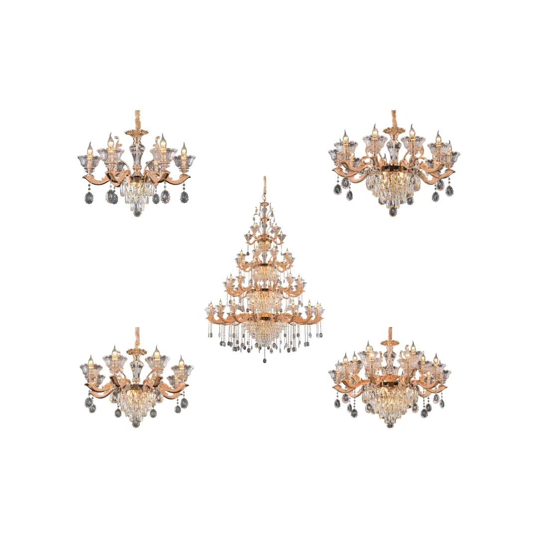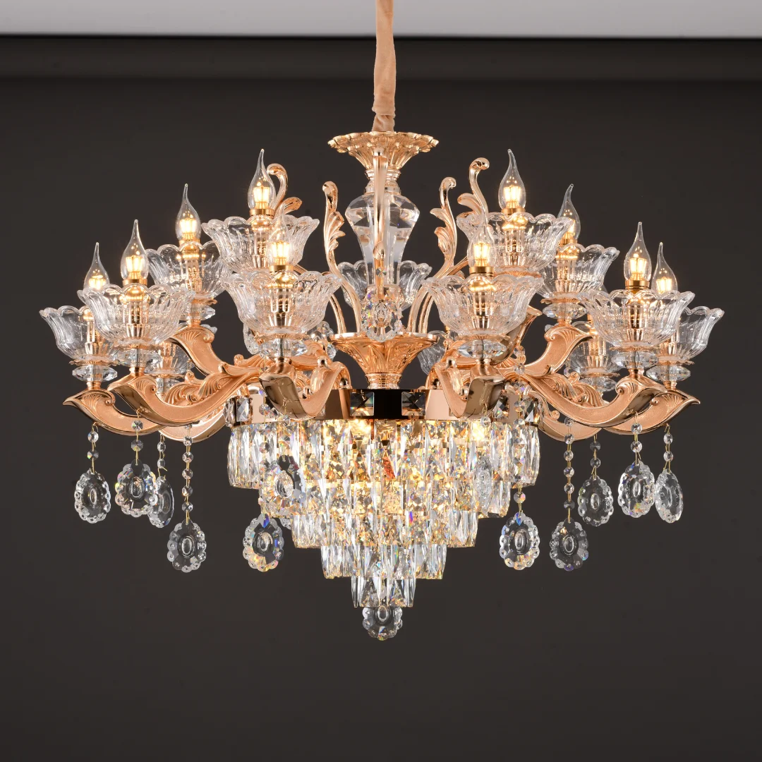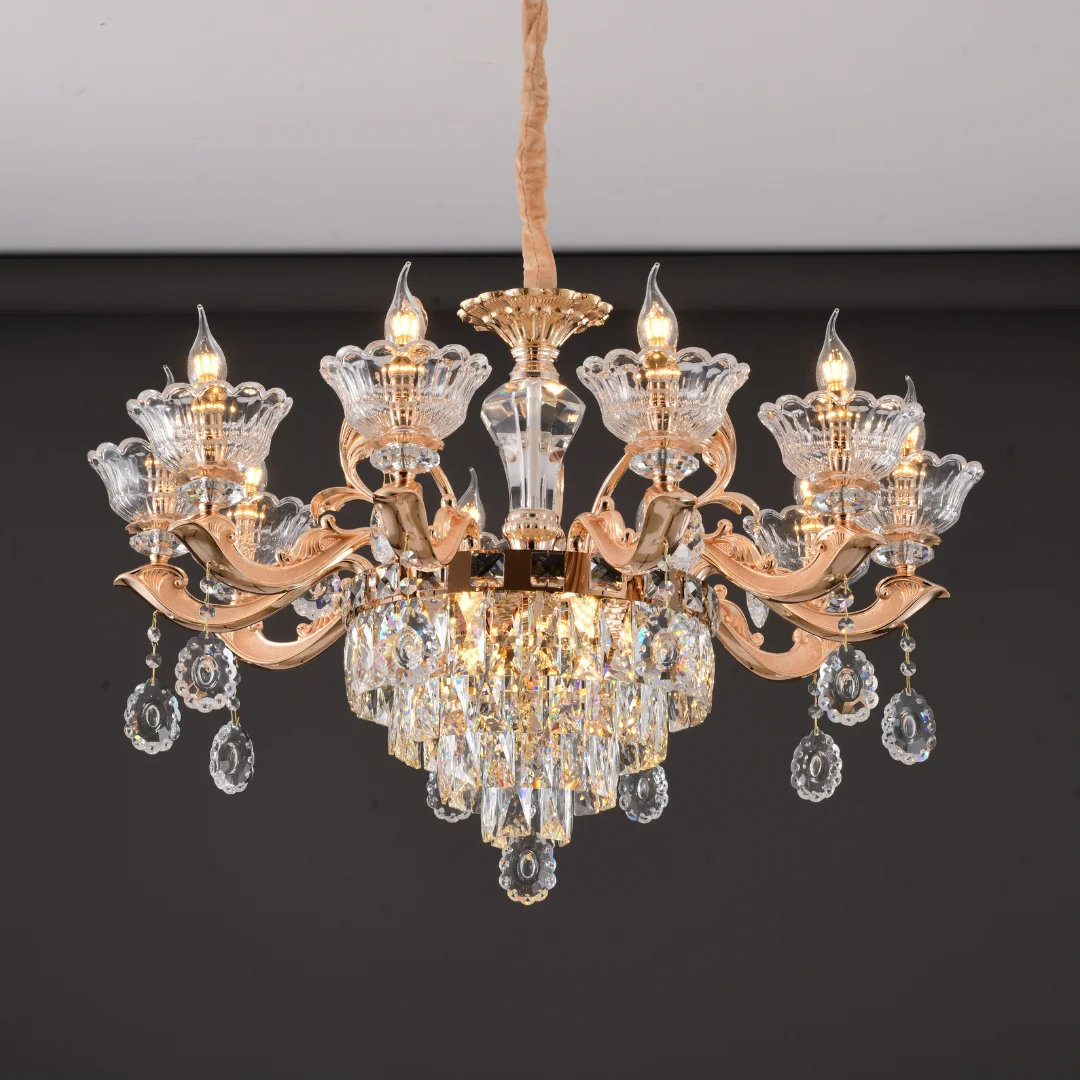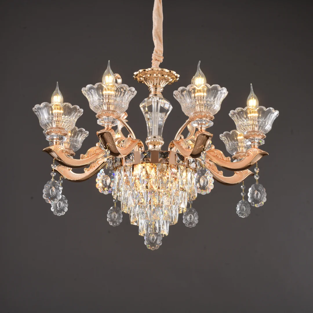 Đèn Chùm Pha Lê DC891 mang dáng chùm tân cổ điển với tay đèn uốn cong mềm mại, phân bố cân đối xung quanh thân đèn trung tâm. Phần chén đèn tạo hình như cánh hoa ôm bóng nến, giúp tổng thể nhìn sang và có độ tinh xảo cao. Bên dưới là lớp pha lê được xếp tầng, kết hợp các chuỗi hạt và giọt thả quanh tay đèn, tạo cảm giác lấp lánh và “đầy” khi nhìn trực diện.