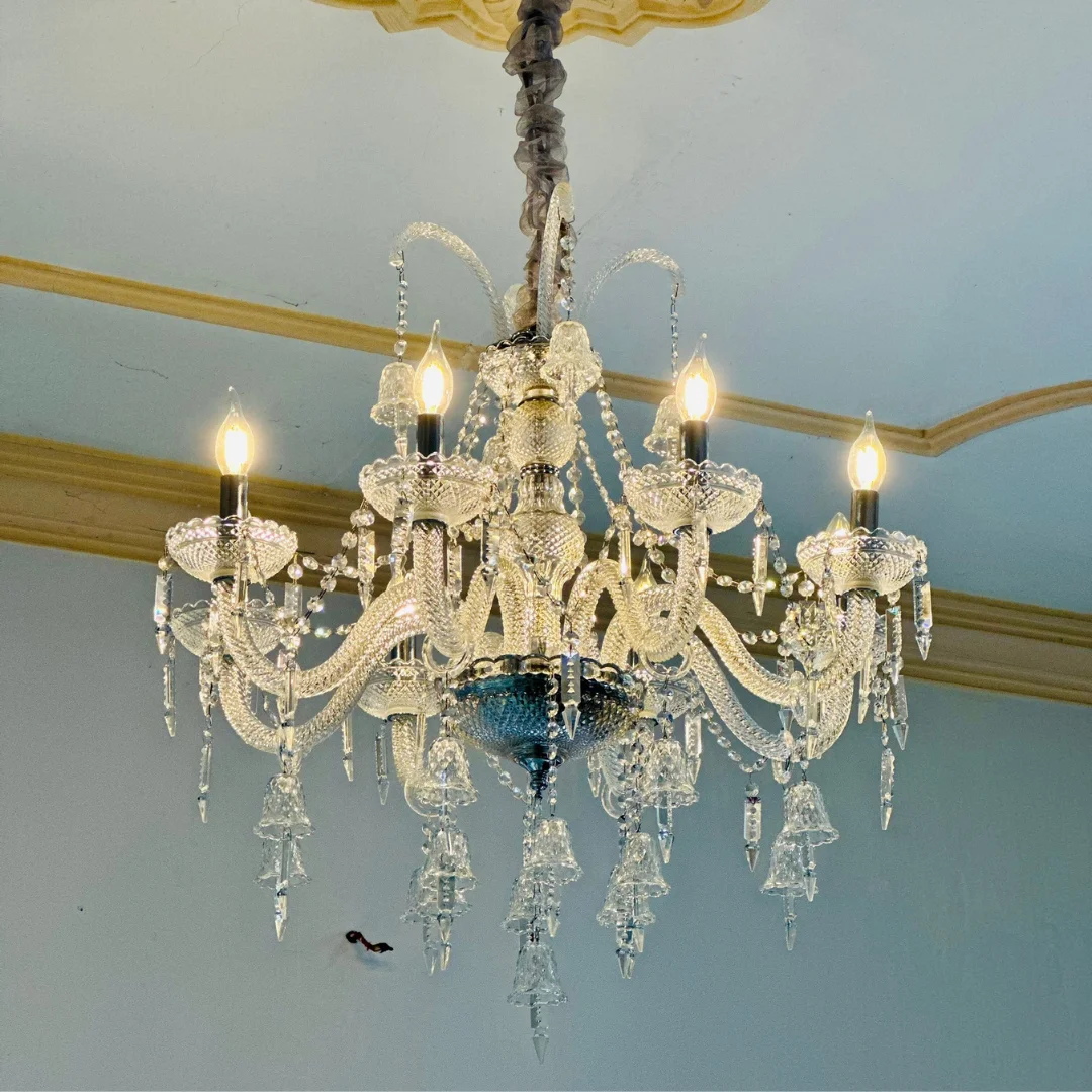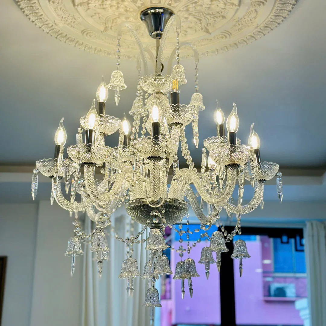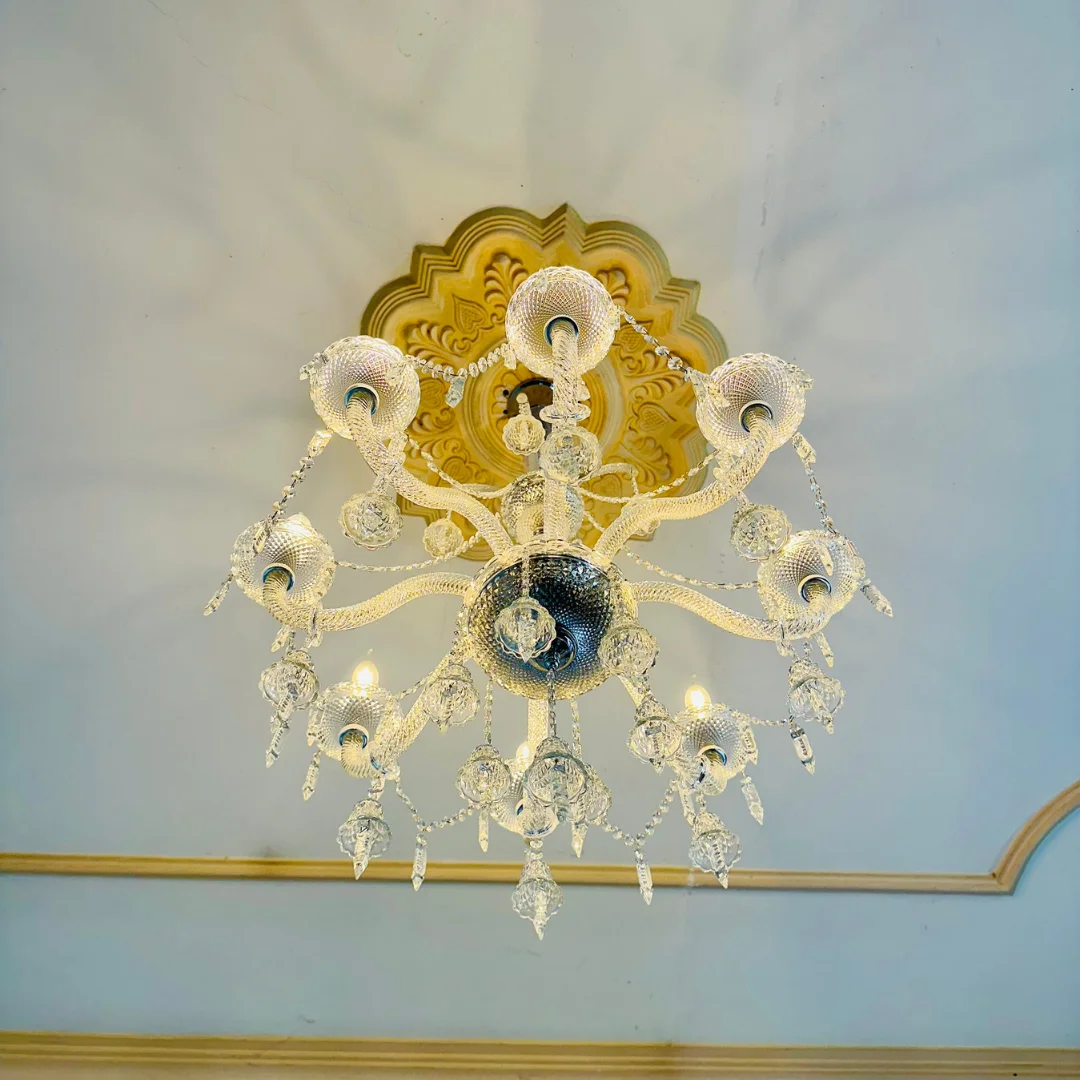 Khung đèn sử dụng hợp kim sơn tĩnh điện giúp bề mặt bền, hạn chế gỉ sét và thuận tiện lau chùi. Pha lê được cắt gọt tinh xảo, khi ánh sáng từ bóng E14 chiếu qua sẽ tạo độ phản chiếu lung linh, giúp không gian trở nên ấm cúng và sang trọng hơn. Hai phiên bản 8 bóng và 12 bóng giúp bạn lựa chọn theo nhu cầu chiếu sáng và diện tích phòng.