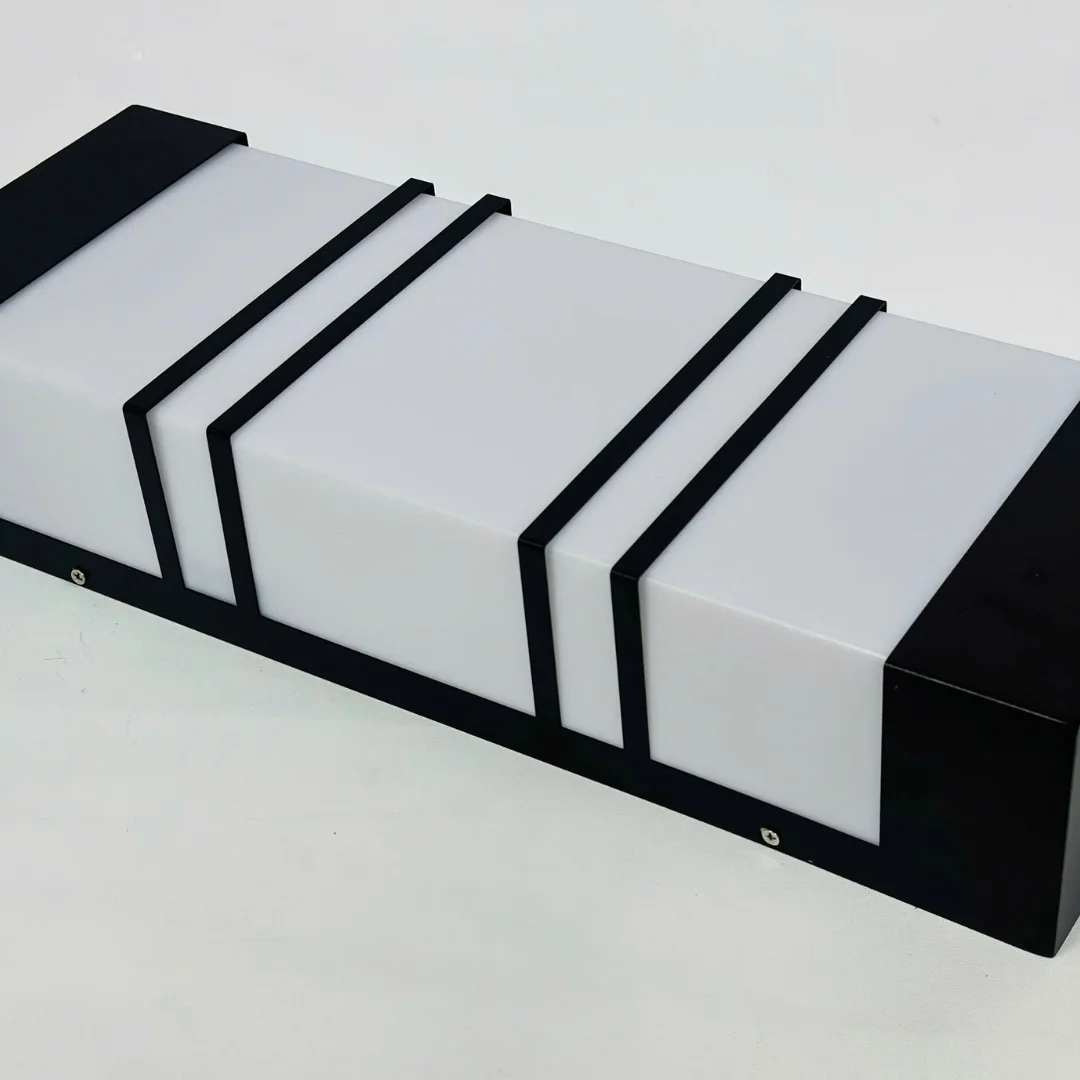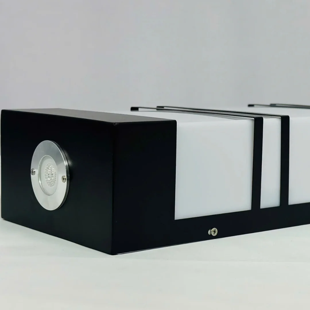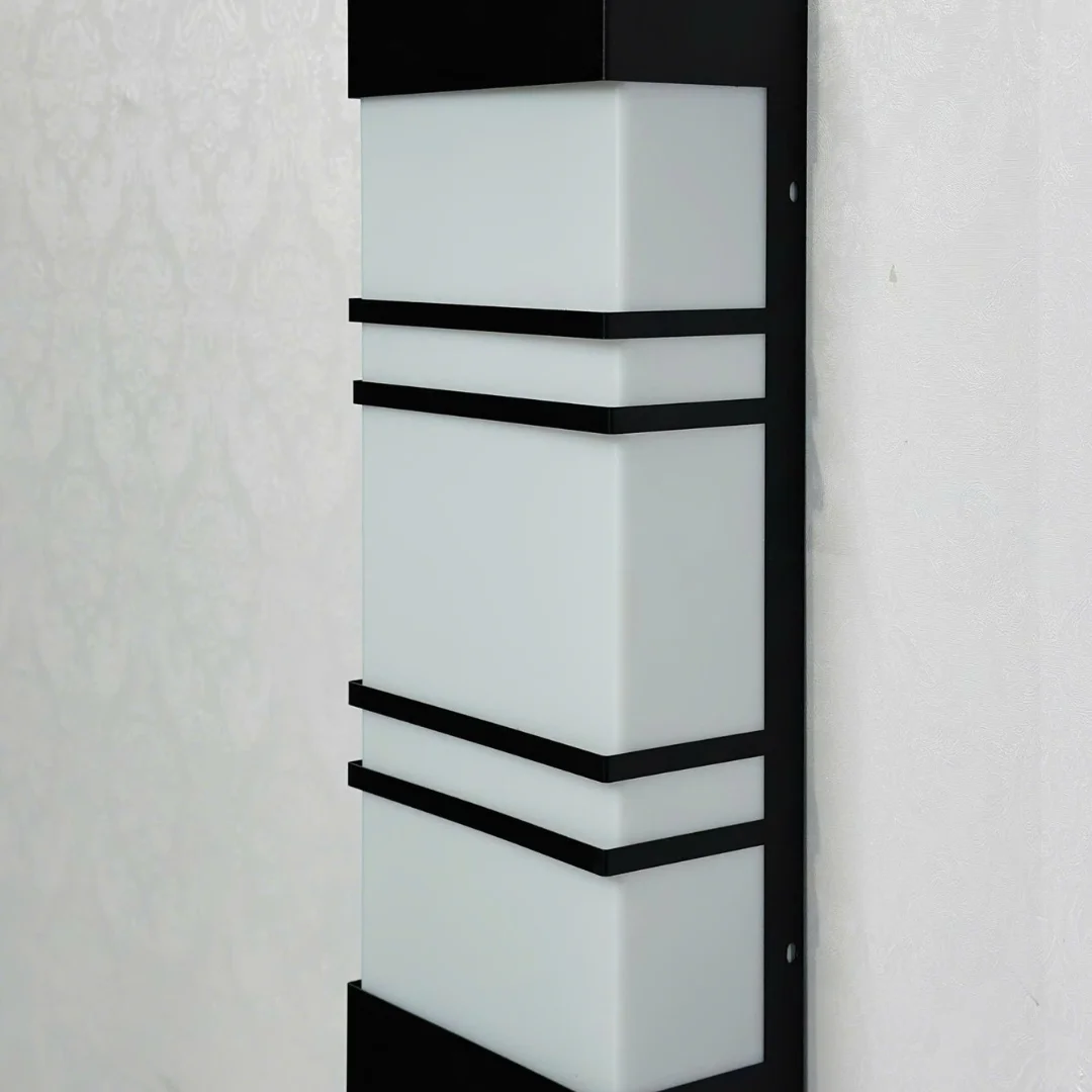 Về chất liệu, sản phẩm mang đặc trưng của dòng đèn gắn tường với khung kim loại sơn tĩnh điện kết hợp phần tán sáng màu trắng mờ. Cấu tạo này phù hợp vì vừa giúp đèn giữ được dáng vuông chắc chắn, vừa hỗ trợ ánh sáng tỏa đều và dịu hơn. Bề mặt hoàn thiện gọn gàng cũng giúp mẫu đèn duy trì vẻ đẹp hiện đại trong quá trình sử dụng lâu dài.