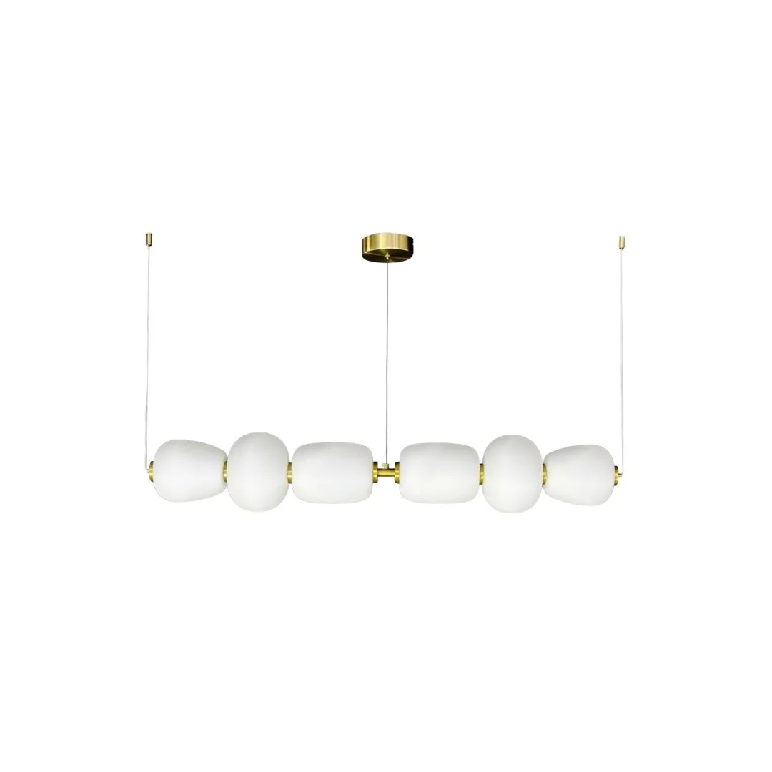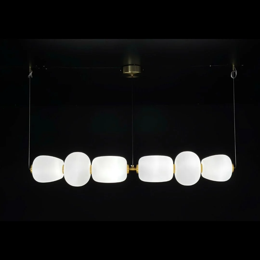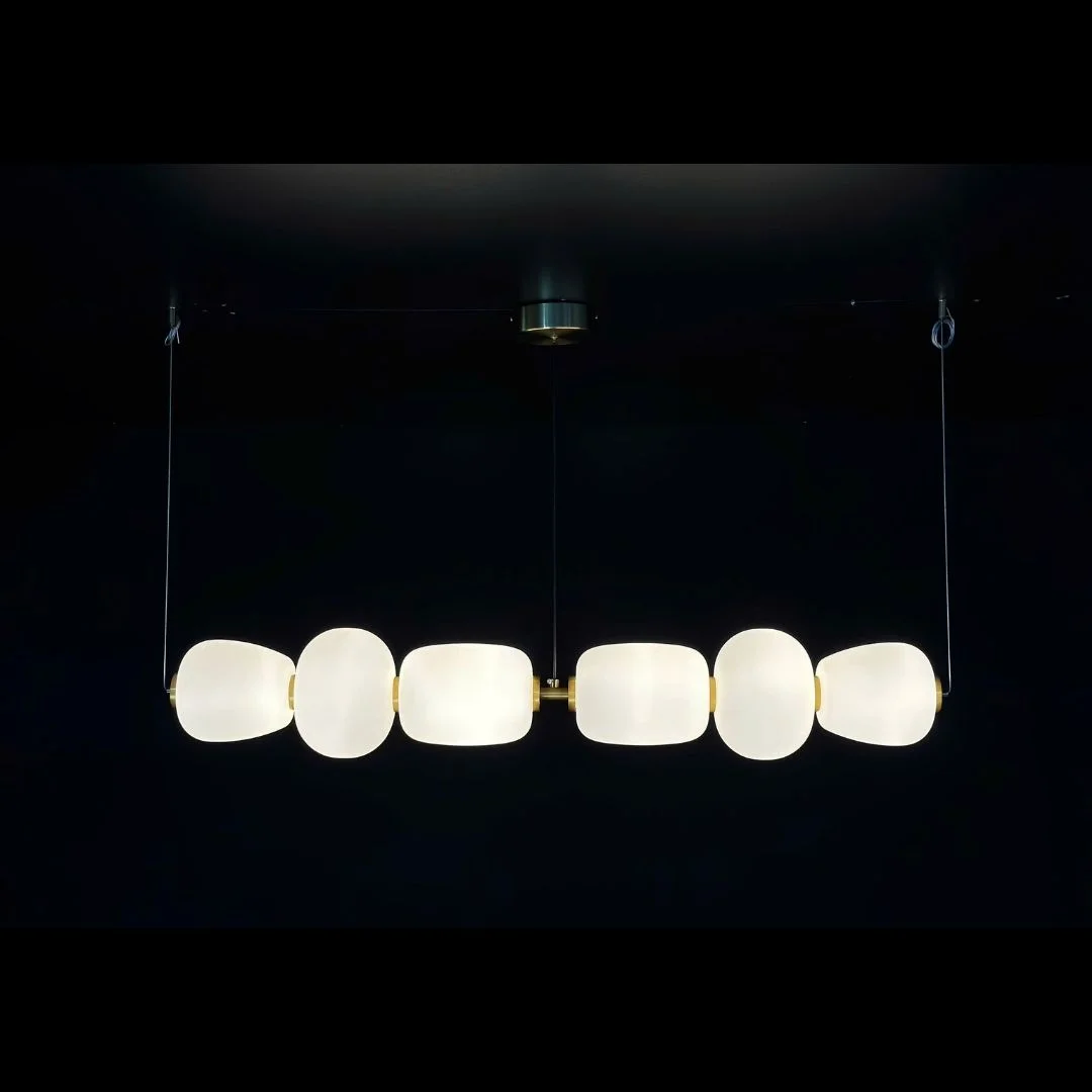 Đèn Thả Hiện Đại THD201 được thiết kế theo dạng thanh ngang dài 1,2 m, tạo một trục nhấn rõ ràng trong không gian. Trên thân đèn là dãy chao acrylic hình khối bo tròn, xếp liên tiếp nhau, khiến tổng thể vừa có nét hiện đại, vừa giữ được sự mềm mại cần thiết cho khu vực sinh hoạt gia đình. Khi treo trên bàn ăn hoặc đảo bếp, chiếc đèn tạo thành một dải ánh sáng chạy dọc, giúp cân đối bố cục và làm nổi bật mặt bàn bên dưới.