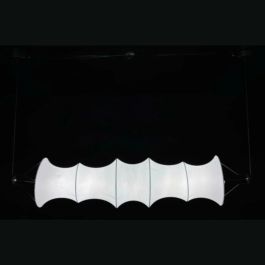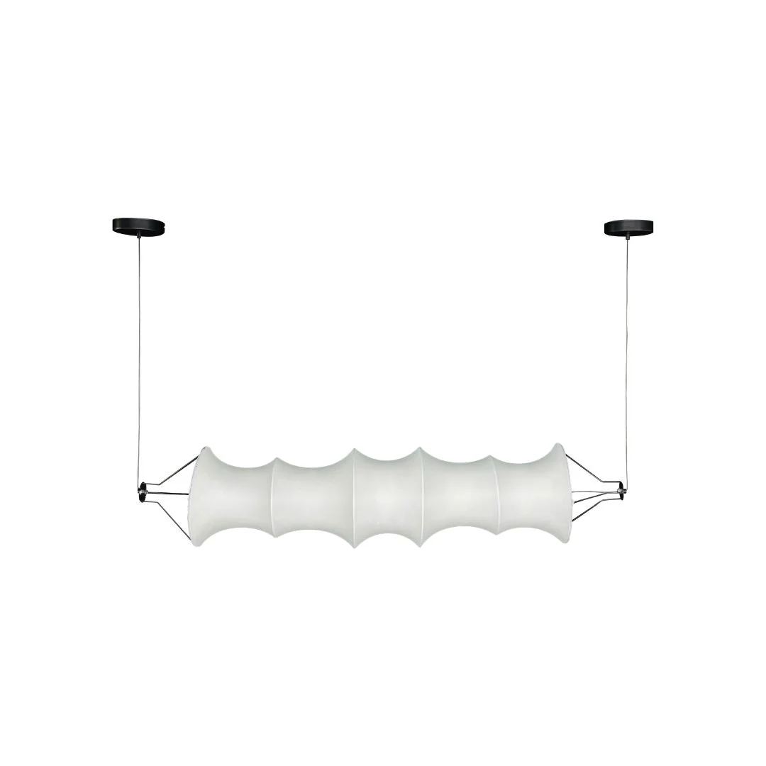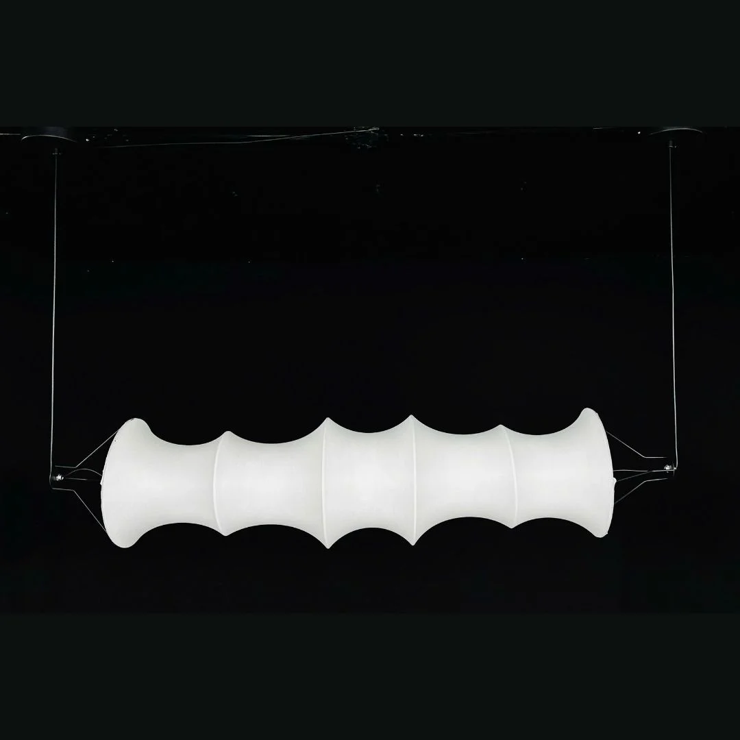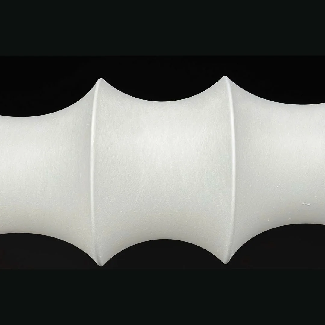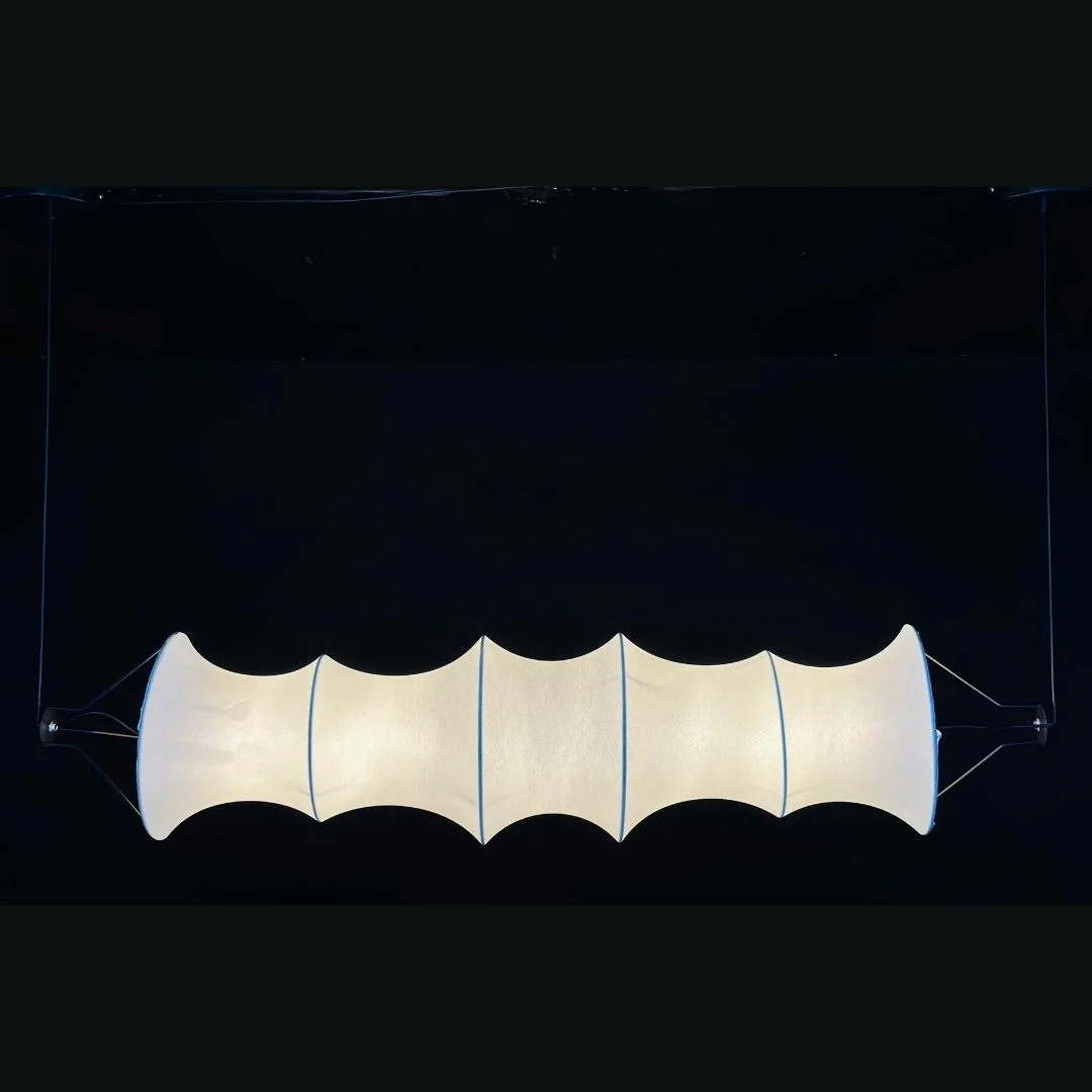 Đèn Thả Hiện Đại THD48 sở hữu thân đèn dạng ống dài 1,2 m, bề mặt chia múi lượn sóng đều, nhìn như một dải vải được tạo phom rất khéo. Thân ống được treo bằng hai dây cáp mảnh nối lên hai đế tròn gắn trần, tạo cảm giác chiếc đèn đang “trôi” giữa không trung, không nặng nề. Khi bật sáng, ánh sáng LED bên trong xuyên qua lớp vải sợi tơ, tỏa đều dọc thân ống, mang lại một dải sáng ấm áp, rất hợp cho khu vực bàn ăn, phòng làm việc hoặc góc tiếp khách.