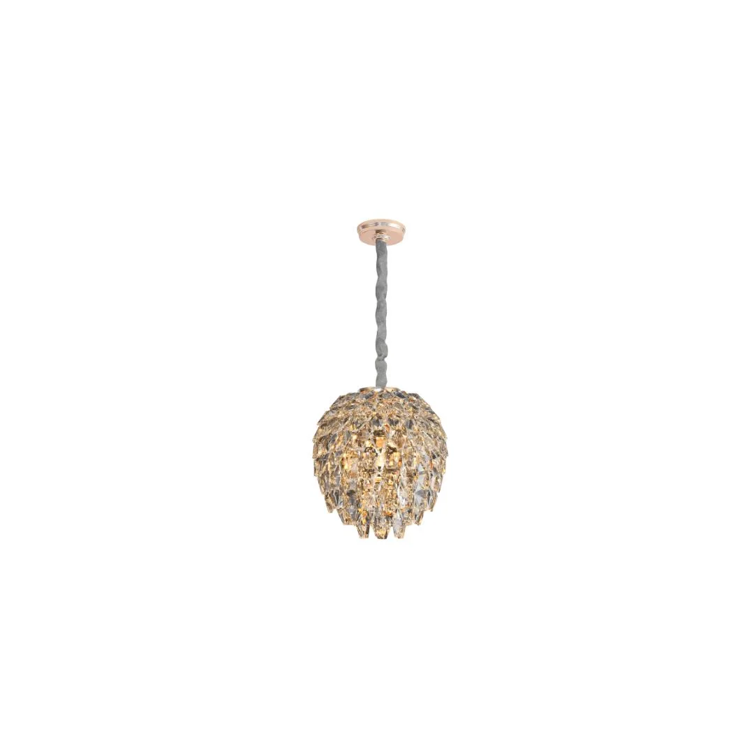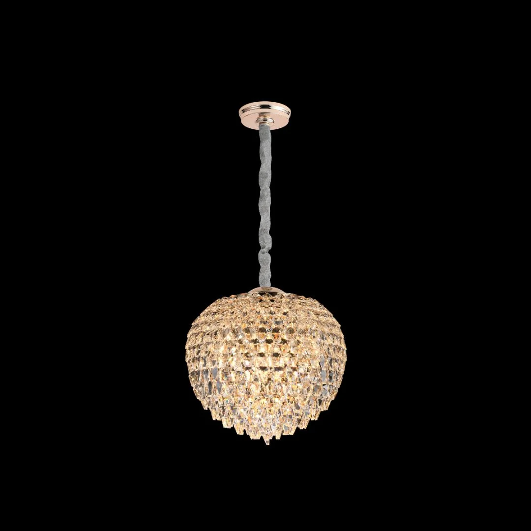 Đèn thả pha lê TPL589 có form tròn như “giọt sáng”, phần pha lê được xếp lớp dày tạo bề mặt bắt sáng mạnh. Khi nhìn trực tiếp, bạn sẽ thấy các lớp pha lê chồng lên nhau tạo chiều sâu, giúp đèn nhìn tinh xảo hơn so với các mẫu chụp trơn. Bản Ø180/Ø235 phù hợp treo tại các điểm nhấn nhỏ (tab đầu giường, góc sofa, quầy bar), còn bản Ø400 phù hợp làm đèn trung tâm cho khu vực bàn ăn nhỏ hoặc phòng ngủ rộng.