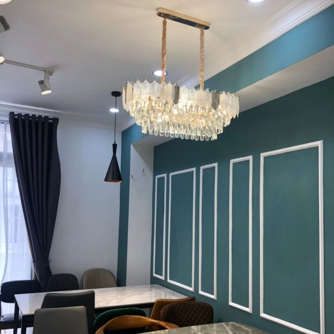 Mẫu đèn thả pha lê TPL8032 thu hút nhờ tạo hình có chiều sâu và giàu tính thẩm mỹ. Phần khung bên ngoài được bo tròn nhẹ hoặc kéo dài cân đối theo từng phiên bản, kết hợp với các chi tiết trang trí mô phỏng hình lá tạo nên cảm giác thanh thoát và mềm mại. Bên dưới lớp trang trí này là hệ pha lê rủ nhiều tầng, cho hiệu ứng chuyển sáng đẹp khi đèn hoạt động. Nhìn tổng thể, sản phẩm mang đến cảm giác sang trọng nhưng không nặng nề, phù hợp với các không gian hiện đại, bán cổ điển hoặc những khu vực cần một điểm nhấn tinh tế.