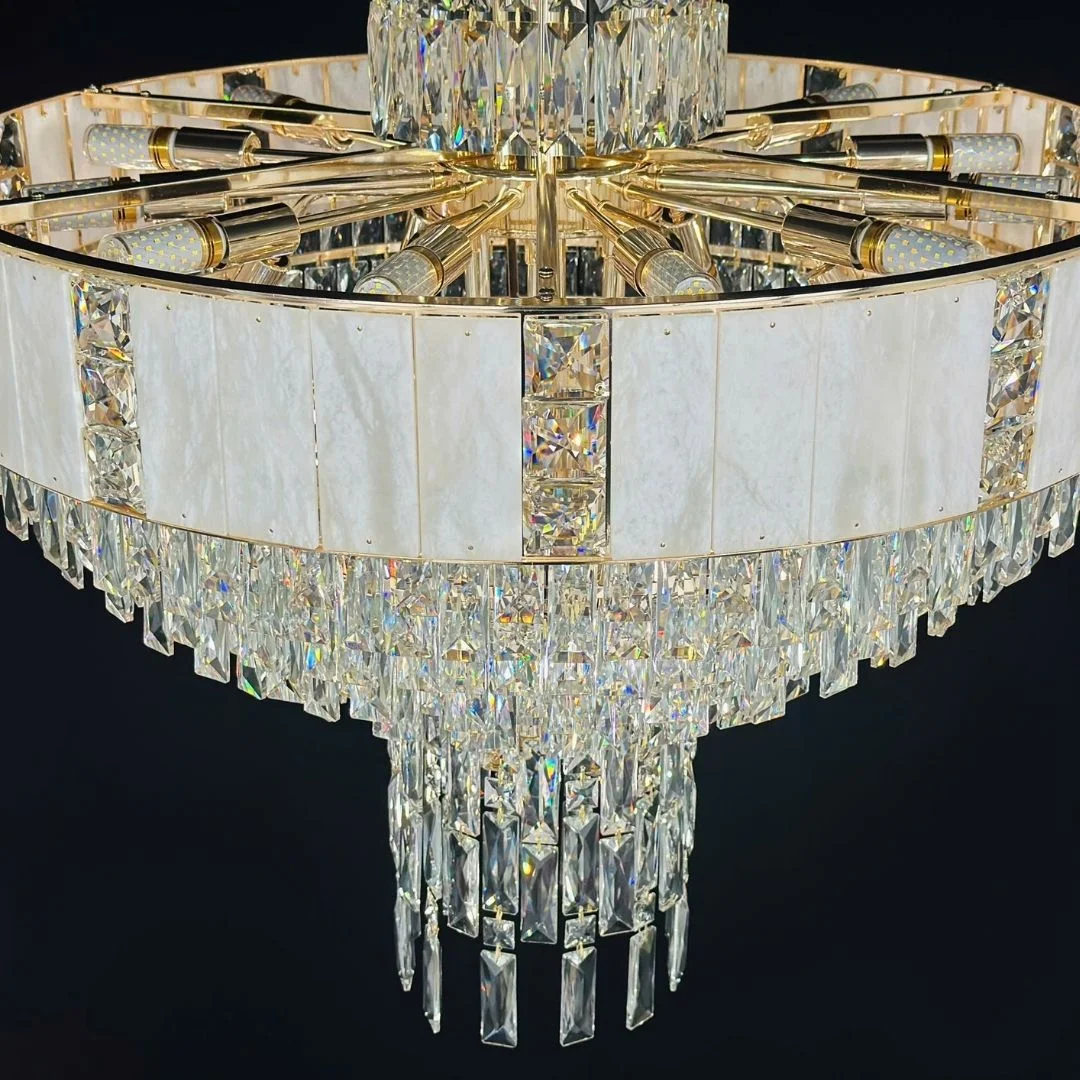 Pha lê K9 giúp đèn nổi bật cả khi bật lẫn khi tắt nhờ độ trong và độ bắt sáng. Khung hợp kim cao cấp đảm bảo sự chắc chắn, hỗ trợ treo ổn định và giữ form đèn bền đẹp theo thời gian.