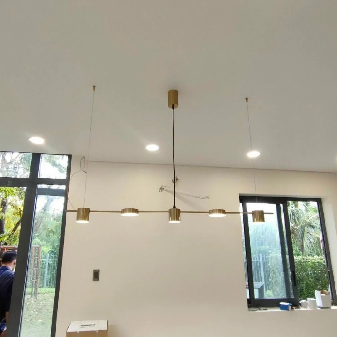Mẫu đèn này nổi bật với cấu trúc thanh ngang kéo dài, được treo bằng các dây mảnh tạo cảm giác thoáng và rất hiện đại khi xuất hiện trong không gian. Các đầu đèn hình trụ được bố trí theo nhịp đều trên thân đèn, giúp tổng thể trông gọn gàng, chỉn chu nhưng không hề đơn điệu. Chính kiểu tạo hình này mang lại cảm giác nhẹ mắt và phù hợp với những không gian cần sự thanh lịch như bàn ăn dài, quầy bar, đảo bếp hoặc khu vực sinh hoạt mở. Với tỷ lệ L1250 x H1500, sản phẩm đặc biệt phù hợp với các phong cách modern, minimalist, contemporary hoặc căn hộ chú trọng sự tinh giản nhưng vẫn muốn có điểm nhấn cao cấp.