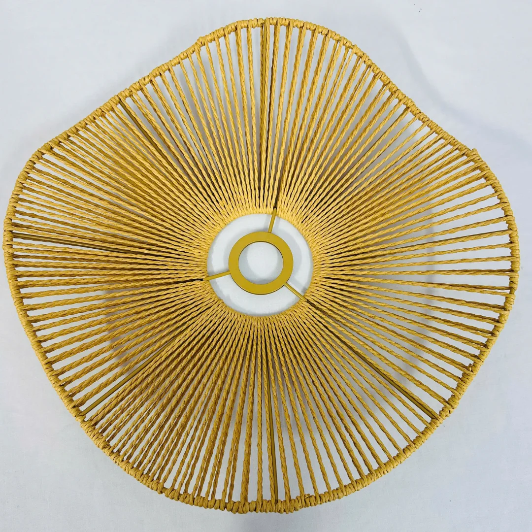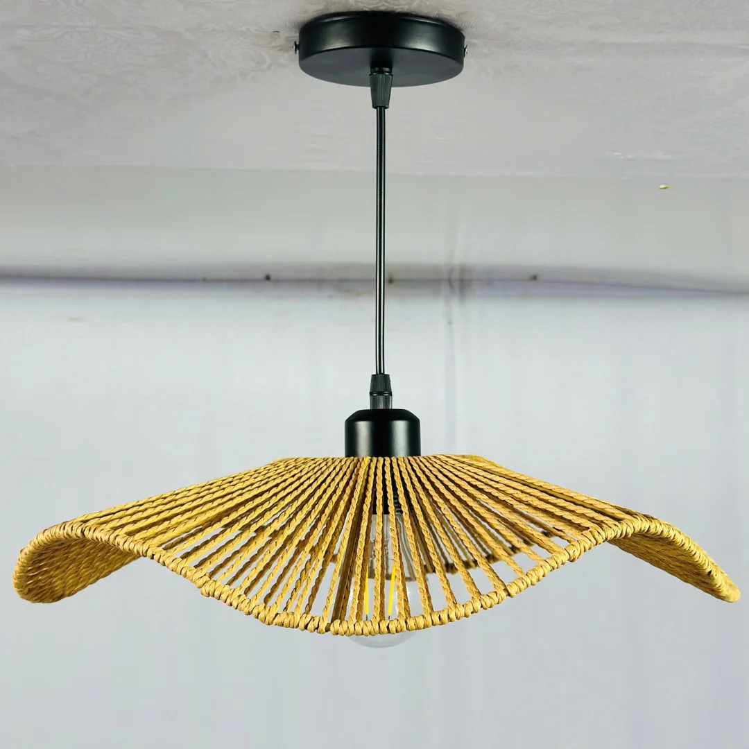 TTK208 nổi bật bởi phần chao đèn dẹt, bo cong mềm theo dạng “làn sóng”, tạo cảm giác bay và thoáng khi nhìn từ xa. Bề mặt đan mây tre có khoảng hở vừa đủ để ánh sáng lọt qua tự nhiên, cho hiệu ứng sáng ấm và dễ chịu. Nếu bạn chọn bóng ánh vàng, khu vực treo đèn sẽ ấm hơn rõ rệt; nếu chọn bóng trung tính, không gian sẽ sáng sạch và hiện đại.