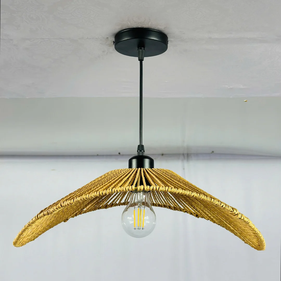 Tông màu mây tre dễ phối với gỗ, đá, tường sơn sáng hoặc không gian có nhiều vật liệu tự nhiên. Dây treo và phần chụp trần tối giản giúp tổng thể gọn gàng, phù hợp các phong cách như tối giản, mộc, Japandi, Tropical hoặc decor quán.