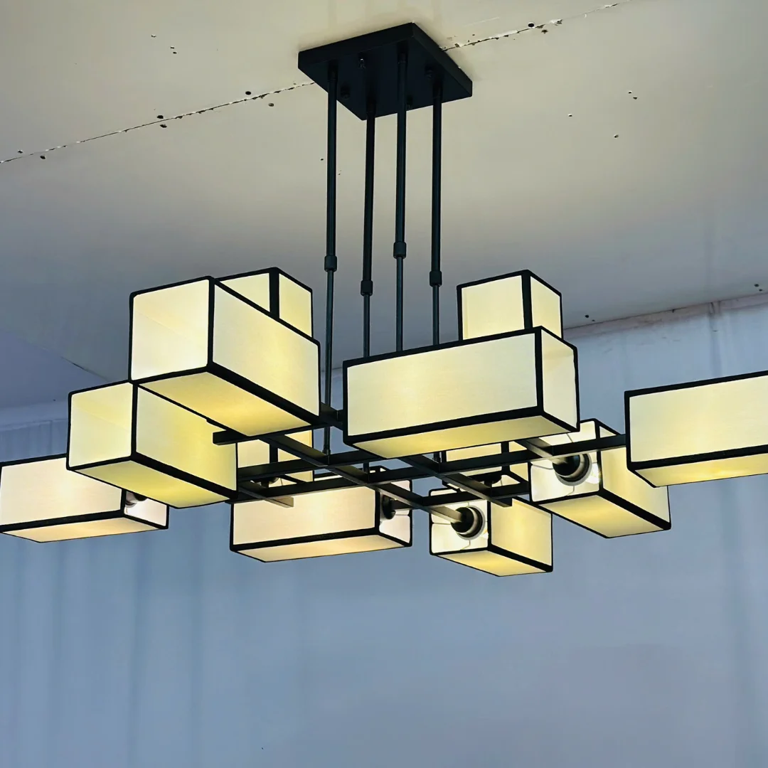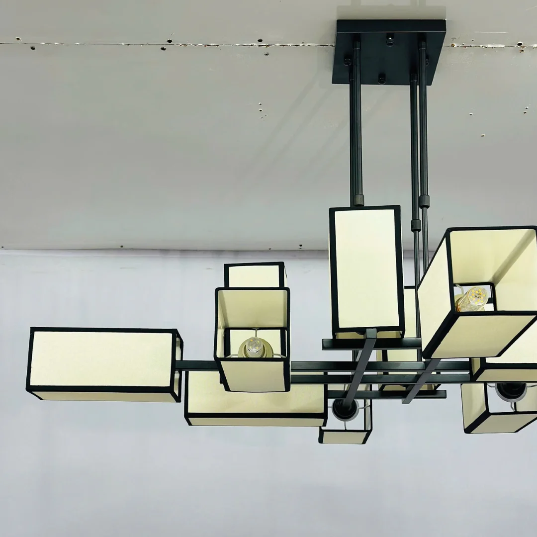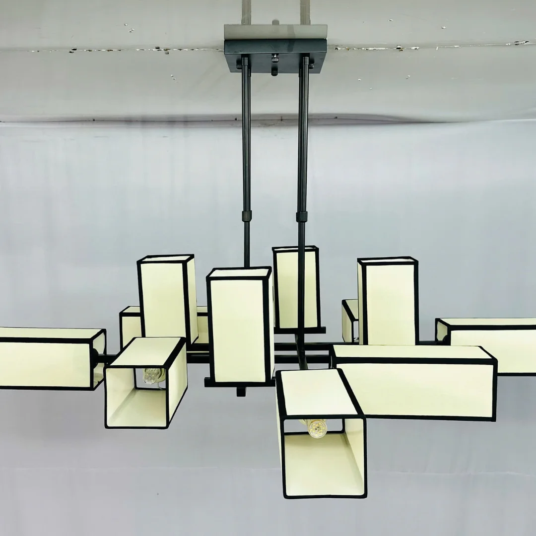 Đèn Thả Thiết Kế TTK300 nổi bật với cấu trúc nhiều thanh ngang đan khéo léo, từ đó “đỡ” các khối tán sáng hình hộp chữ nhật trải đều theo nhiều hướng. Nhìn tổng thể, đèn tạo cảm giác cân đối nhưng vẫn rất ấn tượng, đặc biệt hợp với trần cao hoặc khu vực cần một món nội thất tạo dấu ấn.