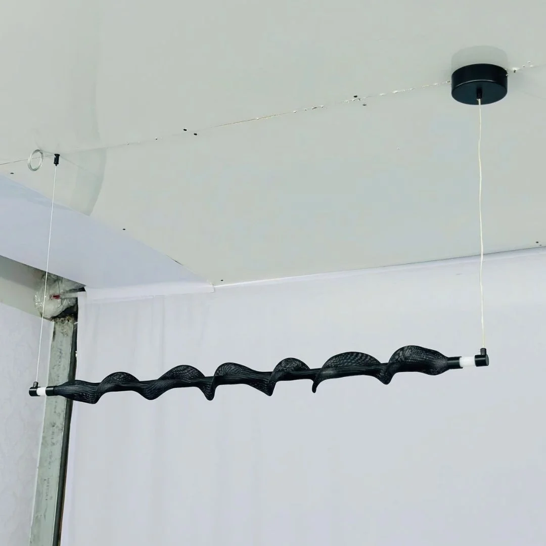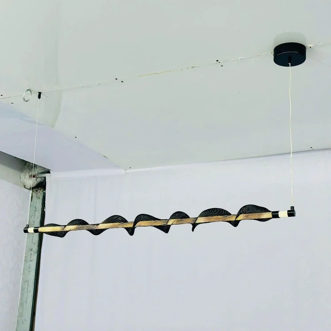 Mẫu đèn này sở hữu thiết kế thanh ngang dài với điểm nhấn là dải trang trí uốn lượn quấn quanh thân đèn, tạo nên cảm giác chuyển động liên tục và rất giàu tính tạo hình. Chính chi tiết này giúp sản phẩm nổi bật rõ rệt hơn so với những mẫu đèn thả thanh thẳng thông thường, đồng thời mang lại vẻ ngoài hiện đại, sắc sảo và có cá tính. Khi được lắp đặt trên bàn ăn, quầy bếp hoặc quầy bar, đèn tạo nên một trục ánh sáng mạnh về mặt thị giác, giúp khu vực bên dưới trở nên nổi bật, chỉn chu và chuyên nghiệp hơn. Với chiều dài L1200, mẫu đèn này đặc biệt phù hợp với các không gian contemporary, minimalist hiện đại hoặc căn hộ yêu thích những chi tiết decor có dấu ấn riêng.