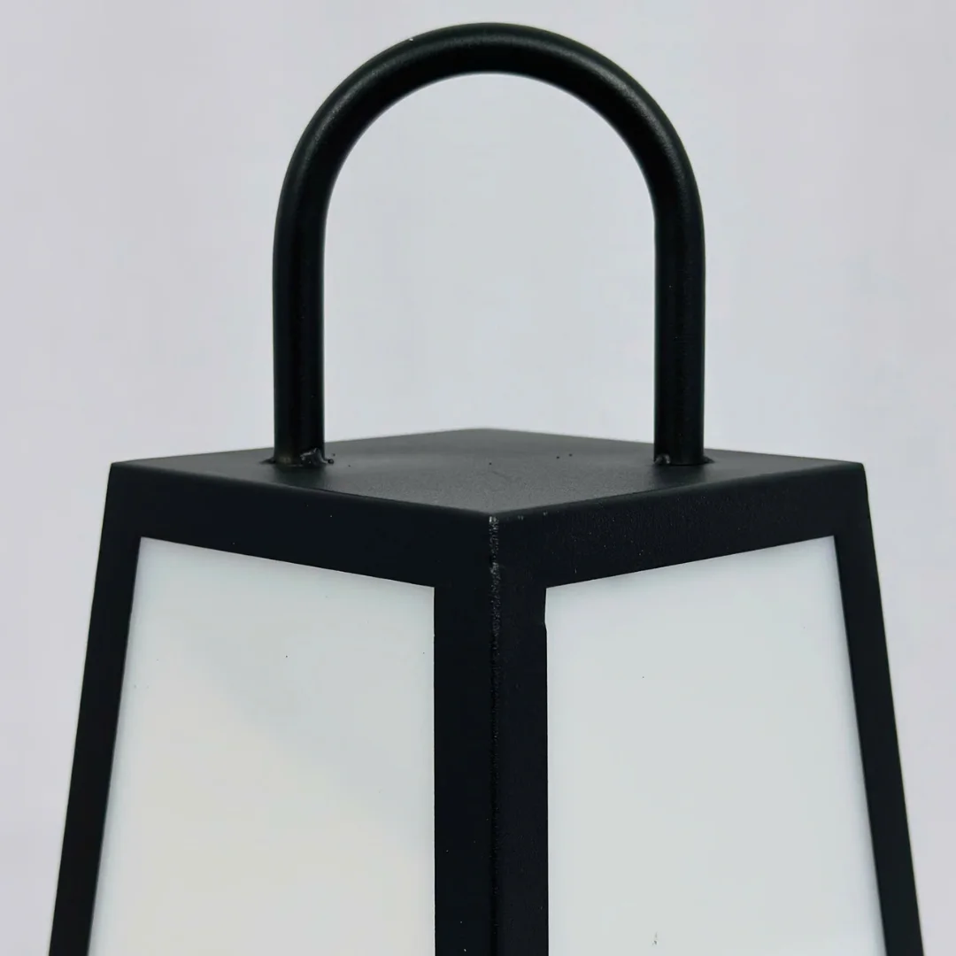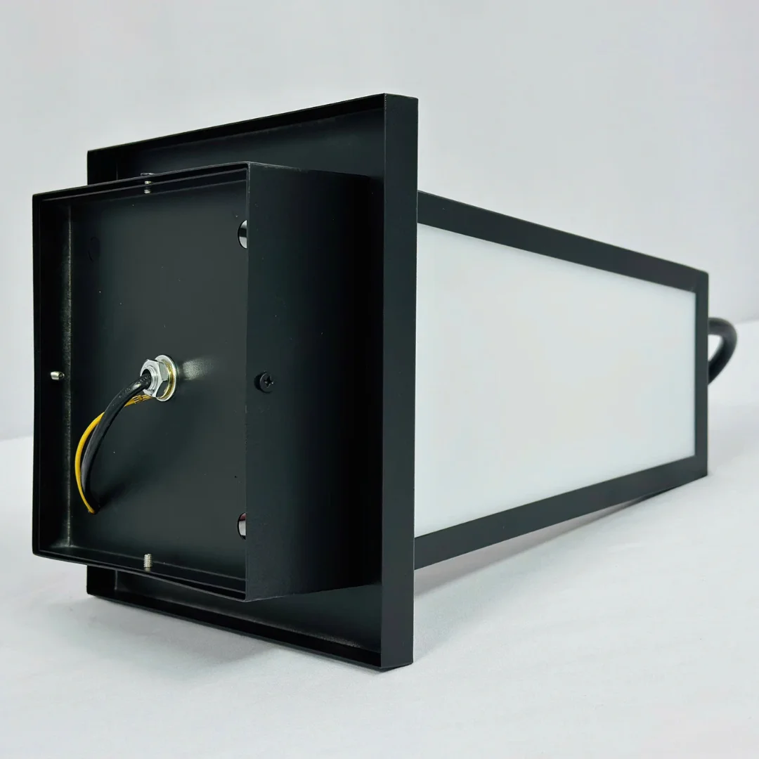 Phần khung đen làm nền rất tốt cho ánh sáng bên trong. Khi bật đèn, mặt tán sáng màu sáng giúp ánh sáng tỏa đều, nhẹ và tạo cảm giác êm mắt. Với những khu vực không cần ánh sáng quá mạnh nhưng vẫn cần đủ rõ để làm đẹp và dẫn hướng, kiểu thiết kế này đặc biệt hợp lý. Xét trên cảm quan sử dụng, mẫu đèn này phù hợp với cấu trúc khung kim loại sơn tối màu kết hợp mặt tán sáng mờ. Cách phối đó vừa giúp chiếc đèn trông hiện đại, vừa hỗ trợ việc sử dụng bền và thuận tiện trong thực tế. Chuẩn bóng E27 x 1 cũng là ưu điểm vì dễ thay bóng và dễ chọn mức sáng phù hợp.