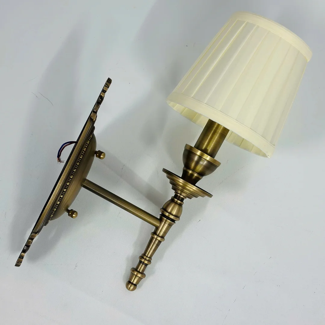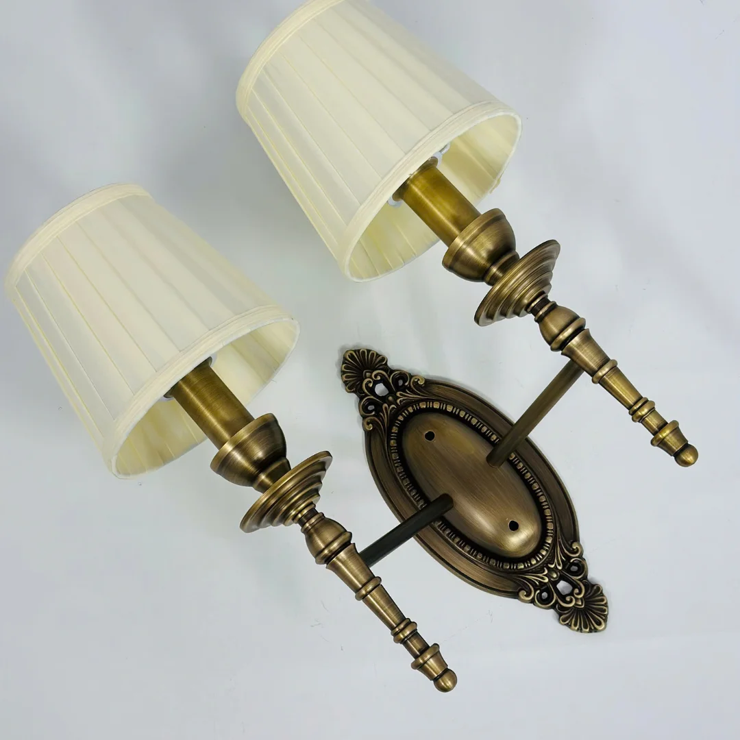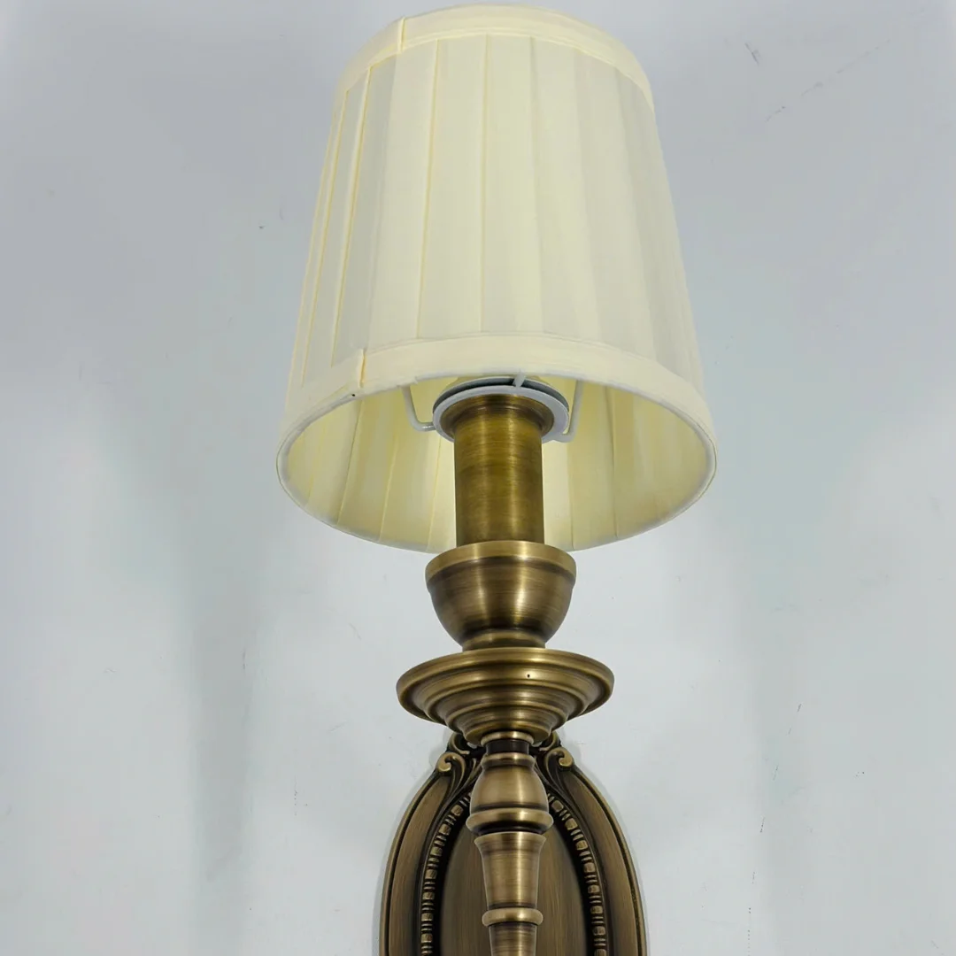 Chụp đèn vải xếp ly màu sáng là chi tiết giúp VDC05 ghi điểm về trải nghiệm ánh sáng. Khi bật đèn, ánh sáng đi qua lớp vải sẽ được tán đều, cho cảm giác ấm, mềm và dễ chịu, rất hợp với phòng ngủ hoặc khu vực cần ánh sáng thư giãn. Thân đèn bằng đồng mang sắc vàng sang, bề mặt sáng đẹp, tạo cảm giác chắc chắn và bền theo thời gian. Với phiên bản 2 bóng, bố cục đối xứng giúp mảng tường “đầy” hơn và lên hình rất đẹp ở khu vực sảnh hoặc hai bên gương.