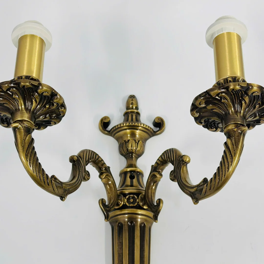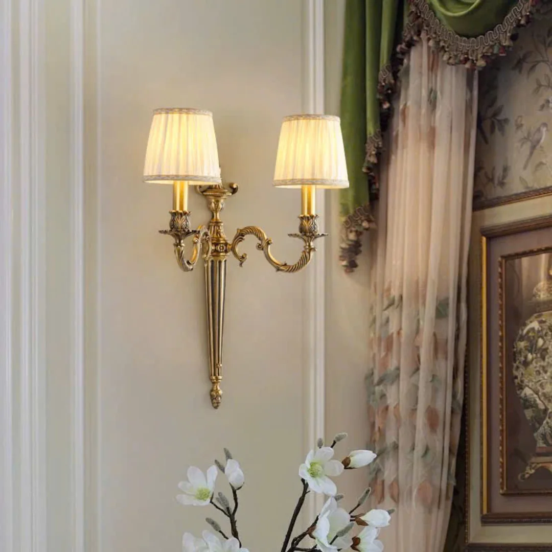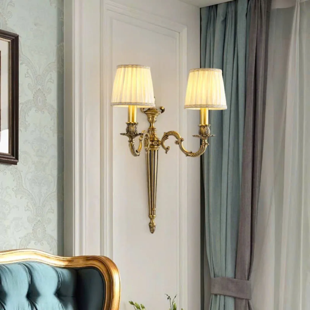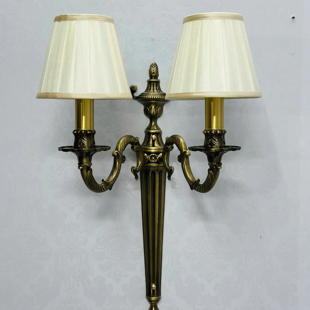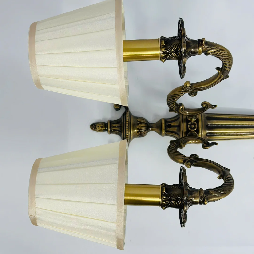 Đèn Tường Đồng VDC06 mang dáng đèn tường cổ điển với trục thân thon dài, các chi tiết bo mềm và hai tay đèn uốn cong đối xứng. Tổng thể vừa “đầy” để tạo điểm nhấn, vừa không quá rườm rà nên dễ phối trong nhiều không gian. Hai chụp vải được làm theo dạng loe nhẹ, khi bật đèn sẽ tán sáng đều, giúp bề mặt tường ấm hơn và nhìn dễ chịu hơn, đặc biệt phù hợp dùng vào buổi tối.
