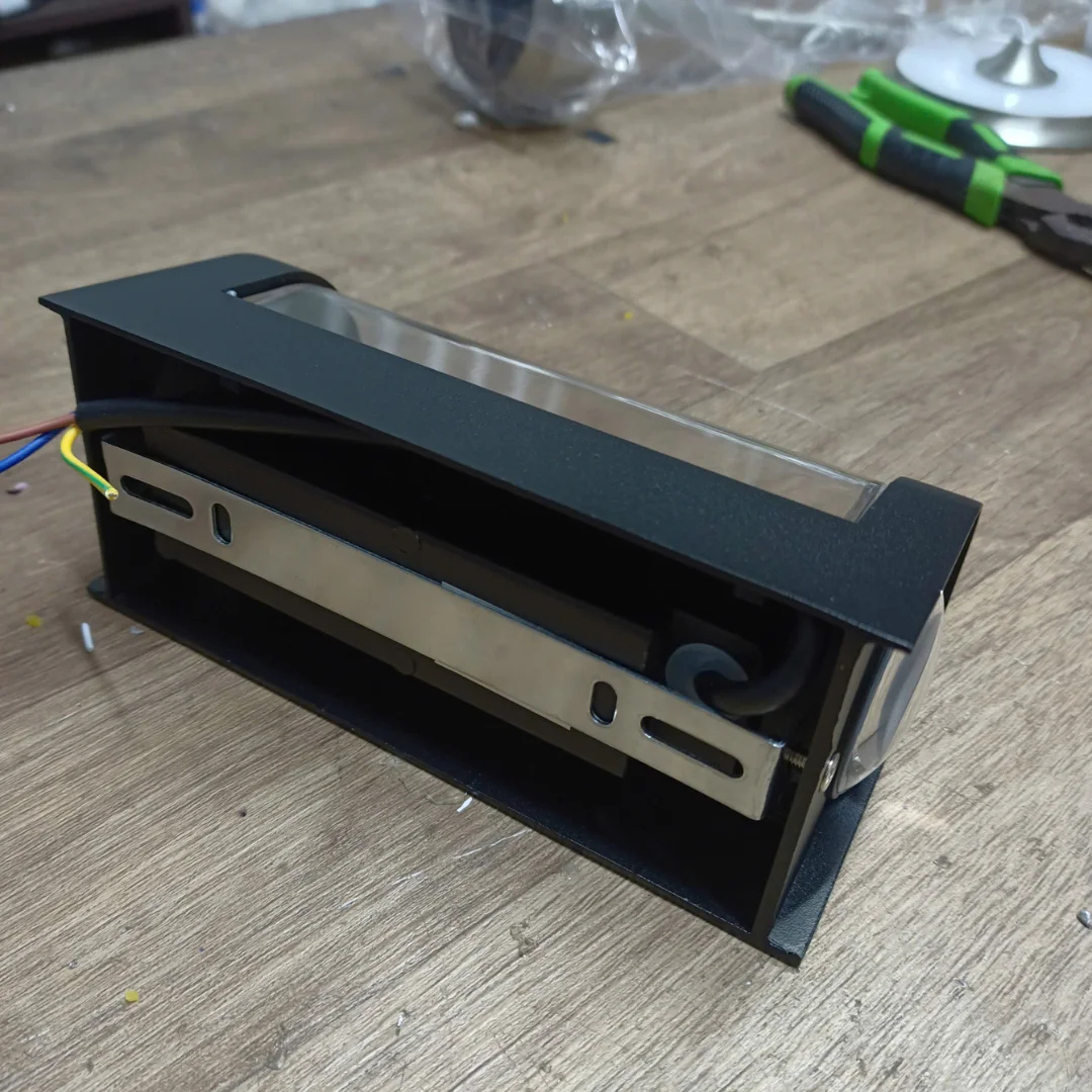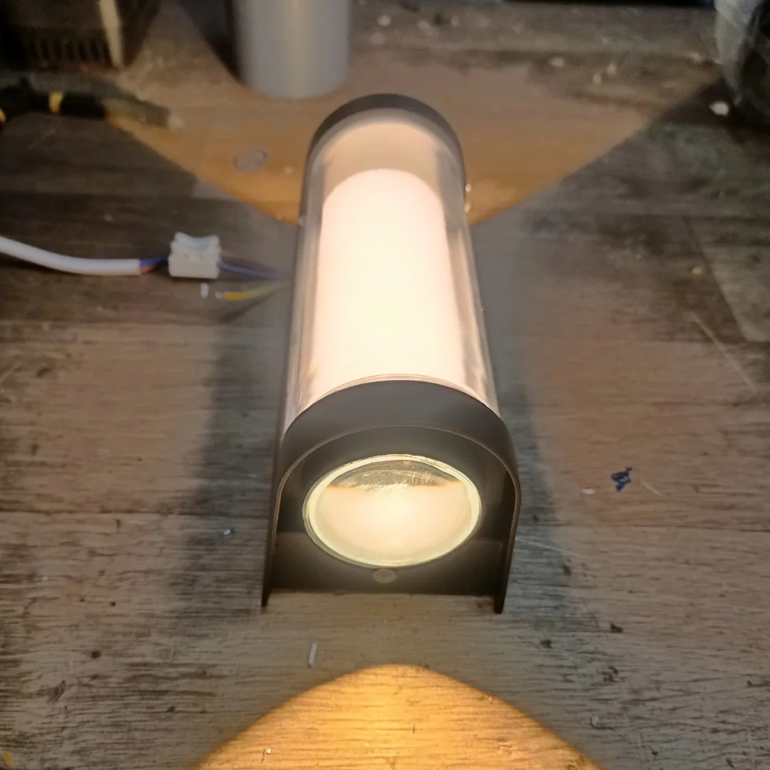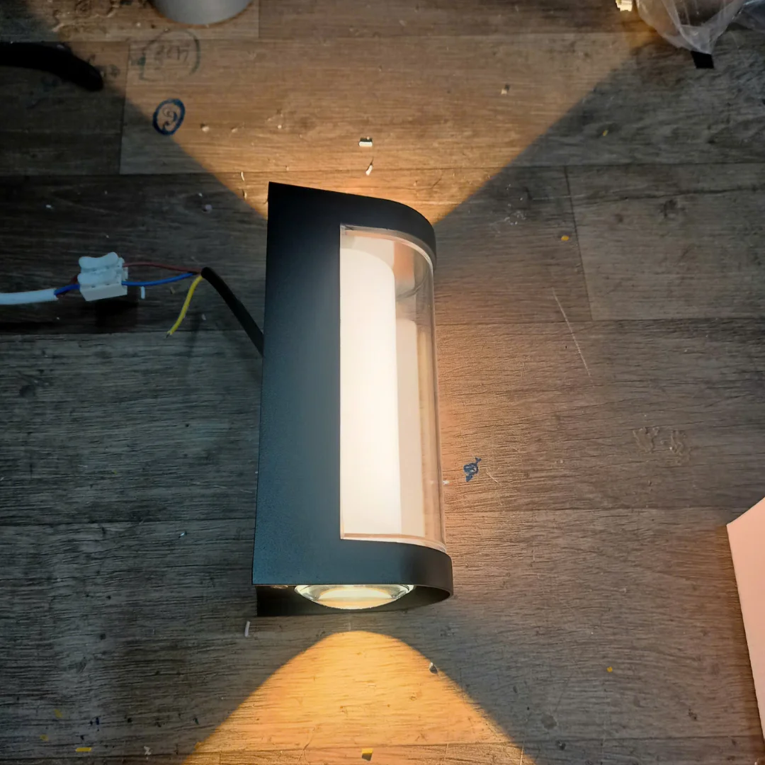 Về chất liệu, sản phẩm mang đặc trưng của dòng đèn tường ngoại thất với khung kim loại hoàn thiện chắc chắn kết hợp phần tán sáng mờ. Kiểu cấu tạo này phù hợp vì giúp đèn giữ được dáng đẹp, tạo cảm giác cứng cáp khi lắp đặt và đồng thời hỗ trợ ánh sáng tỏa ra dịu hơn. Bề mặt hoàn thiện gọn gàng cũng làm cho sản phẩm trông sang và sạch mắt trong tổng thể không gian.