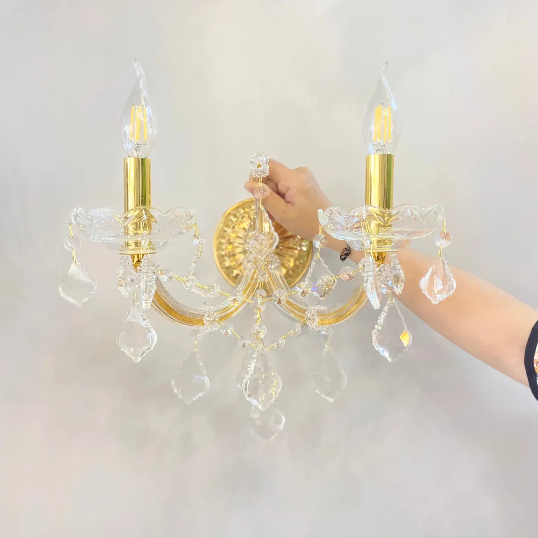 Đèn Tường Pha Lê VDC81156T2 có thiết kế 2 tay đèn cân đối, tạo cảm giác hài hòa khi treo lên tường. Phần đế và thân đèn tông ánh vàng giúp tổng thể trông sang, kết hợp các chi tiết trong suốt làm đèn nhìn nhẹ và thanh. Bên dưới là các giọt pha lê thả rủ, khi lên đèn sẽ phản chiếu ánh sáng đa chiều, tạo hiệu ứng lấp lánh rất đẹp, đặc biệt vào buổi tối.