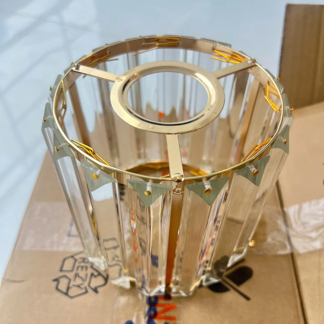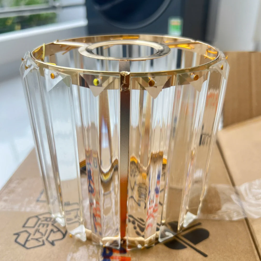 Về chất liệu, sản phẩm sử dụng pha lê phối cùng kim loại màu vàng đồng. Phần pha lê giúp ánh sáng tỏa ra đẹp hơn, dịu hơn và tạo hiệu ứng trong trẻo cho không gian. Phần kim loại vừa làm nhiệm vụ giữ kết cấu chắc chắn, vừa tăng vẻ sang trọng cho sản phẩm, giúp mẫu đèn phù hợp với nhiều phong cách nội thất như hiện đại, thanh lịch hoặc sang nhẹ.