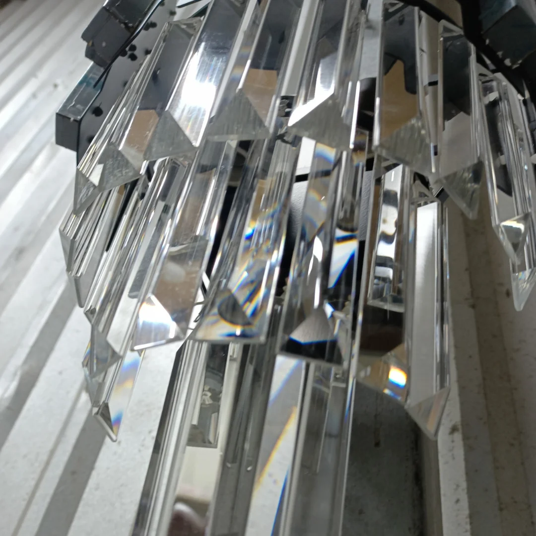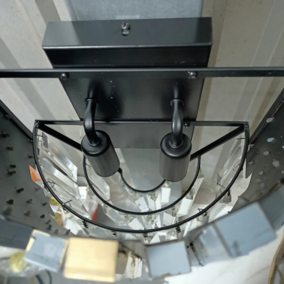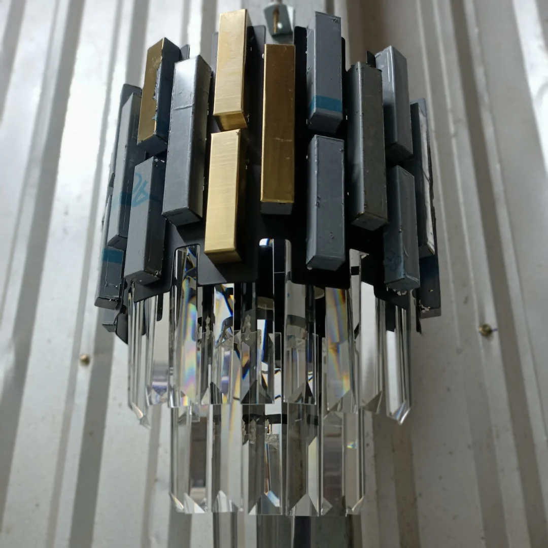 Về chất liệu, sản phẩm sử dụng pha lê phối cùng kim loại ánh vàng đậm, mang lại sự cân bằng giữa vẻ đẹp và độ bền. Phần pha lê giúp ánh sáng phản xạ tốt hơn, làm khu vực lắp đặt trở nên sang trọng và sáng rõ hơn mà không quá gắt. Phần kim loại giúp giữ form đèn ổn định, đồng thời tạo cảm giác cao cấp, rất hợp với nội thất hiện đại, boutique hoặc phong cách luxury nhẹ.
