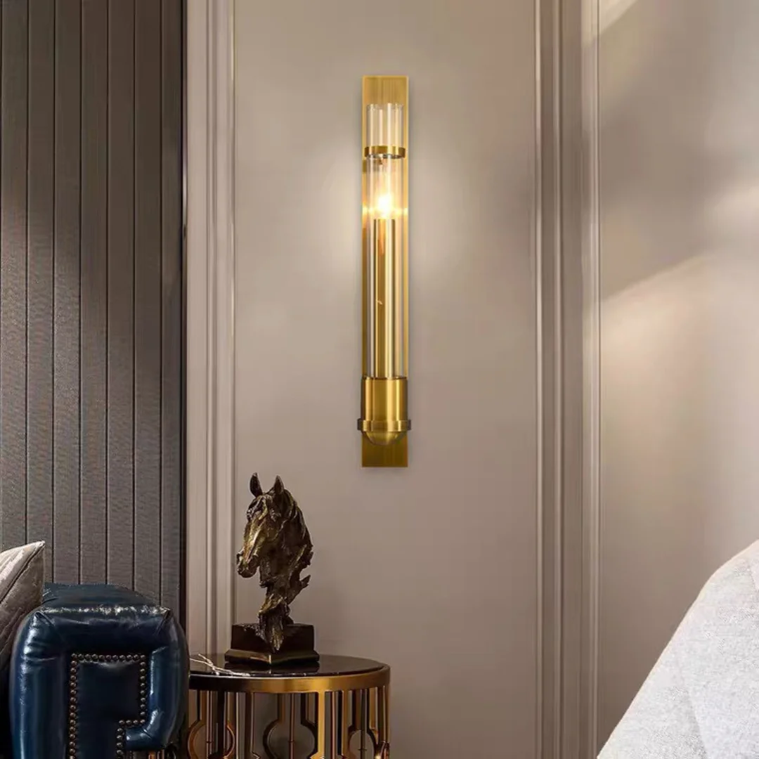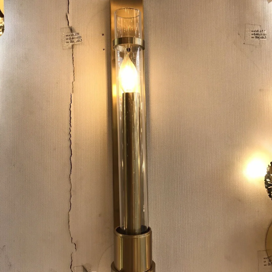 Về chất liệu, sản phẩm nổi bật với khung kim loại ánh vàng đồng và ống kính trong. Kính trong giúp ánh sáng phát ra rõ, đẹp và tạo cảm giác sạch, hiện đại. Khung kim loại lại làm tổng thể thêm chắc chắn, đồng thời mang lại vẻ sang nhẹ rất phù hợp với không gian nội thất cao cấp, boutique hoặc những công trình chú trọng tính thẩm mỹ lâu dài.