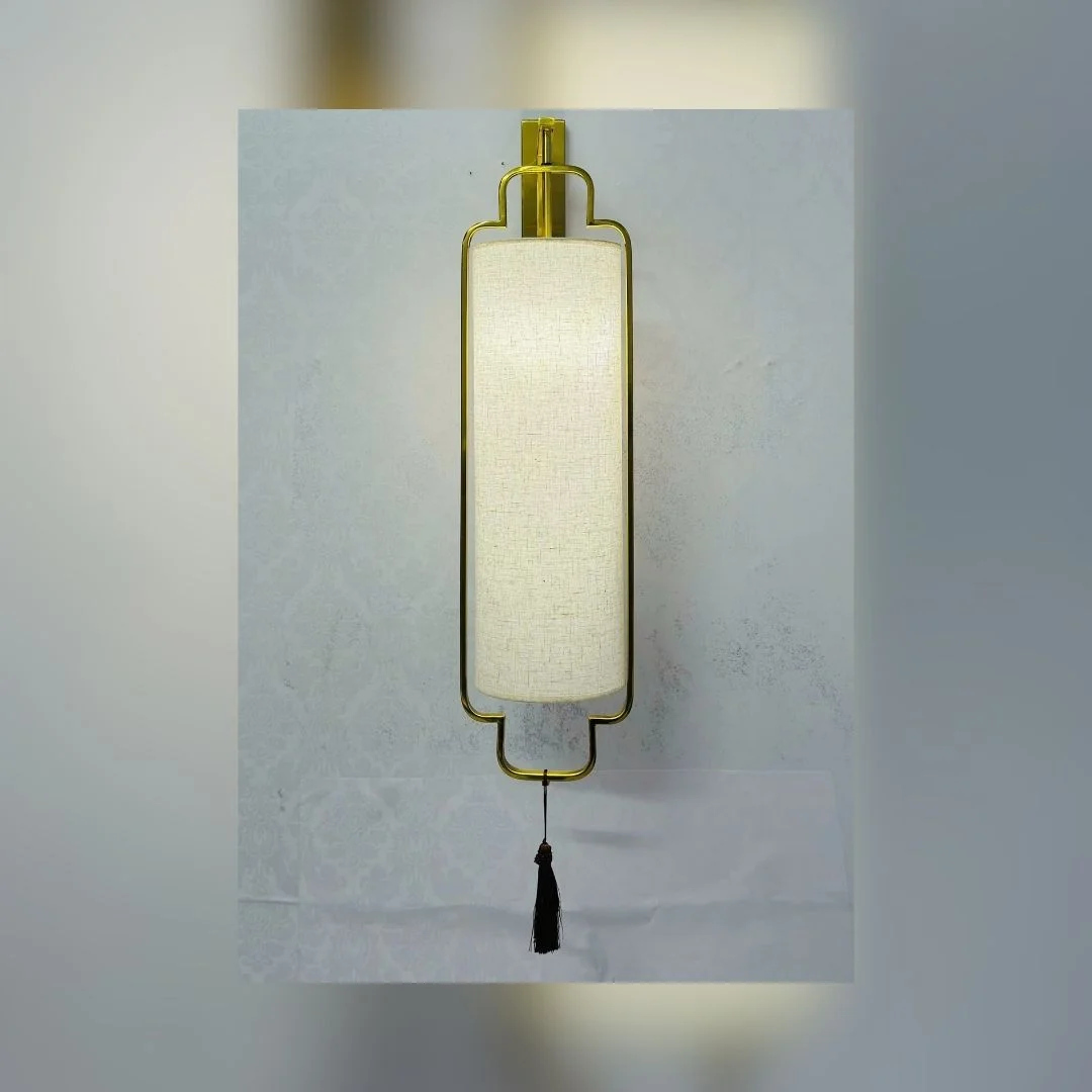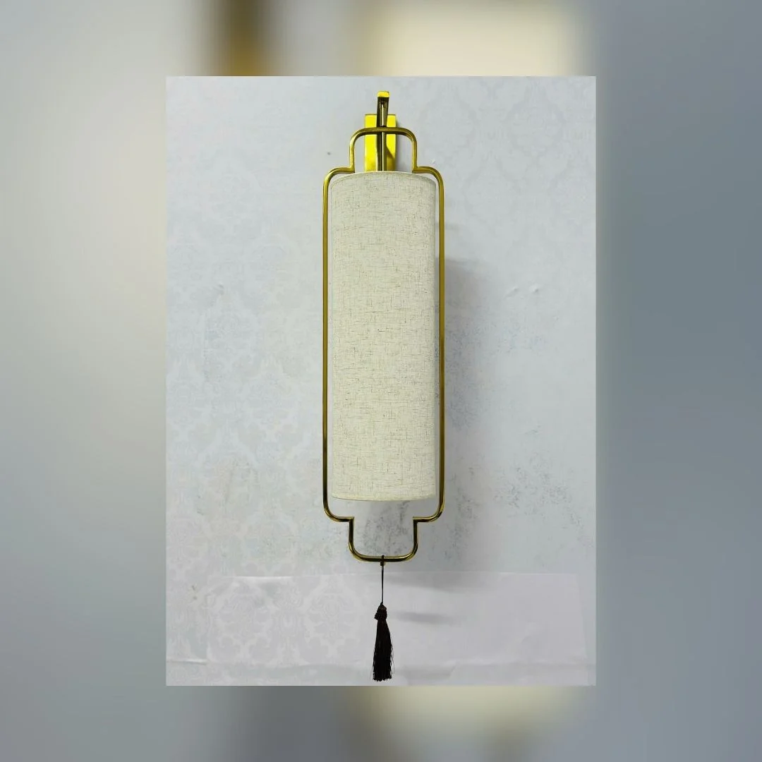 Đèn Tường VK154 được thiết kế theo dạng trụ đứng cao, tạo cảm giác mảnh nhưng vẫn vững. Chao vải hình trụ dài ôm gọn nguồn sáng bên trong, phía ngoài là khung xi đồng thanh mảnh ôm theo chiều dọc, tạo cảm giác sang trọng mà không bị nặng nề. Phần tay đèn và bản đế được xử lý với những đường cong nhẹ, cân bằng giữa nét cổ điển và hiện đại. Bên dưới là chi tiết tua rua đen mềm mại, gợi liên tưởng đến những chiếc đèn lồng Á Đông, mang lại nét chấm phá rất riêng cho bức tường.