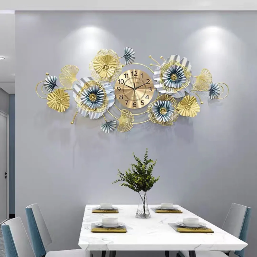 Điểm thu hút của Đồng Hồ DH2911 là bố cục trải ngang rất thoáng, tạo cảm giác như một cành hoa nghệ thuật nở rộng quanh phần đồng hồ trung tâm. Các cụm hoa lớn nhỏ đan xen với đường nét uốn mảnh giúp tổng thể có độ chuyển động đẹp, không bị nặng nề dù kích thước khá lớn. Khi treo trên tường, sản phẩm tạo cảm giác bức tường có chiều sâu hơn và bớt trống rõ rệt.