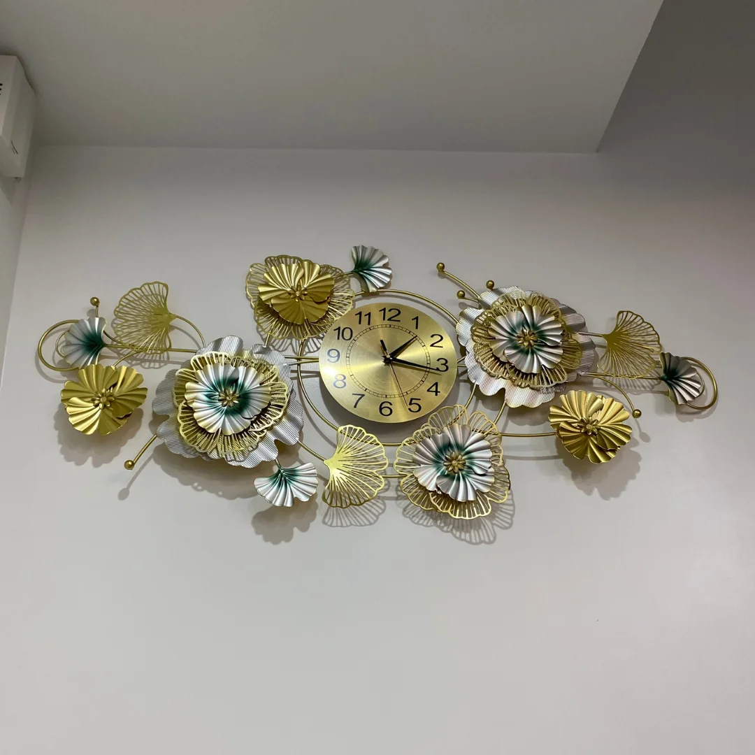 Về chất liệu, nhìn từ hình ảnh có thể thấy mẫu này thiên về kim loại decor tạo hình với các cánh hoa phối sắc vàng, đen và trắng ánh kim. Mặt đồng hồ trung tâm đồng màu với tổng thể nên rất hài hòa. Chính sự kết hợp màu sắc này khiến sản phẩm dễ hòa vào nhiều phong cách nội thất, từ hiện đại thanh lịch đến sang trọng nhẹ, đặc biệt phù hợp với những không gian cần decor nổi bật nhưng không quá rối mắt.